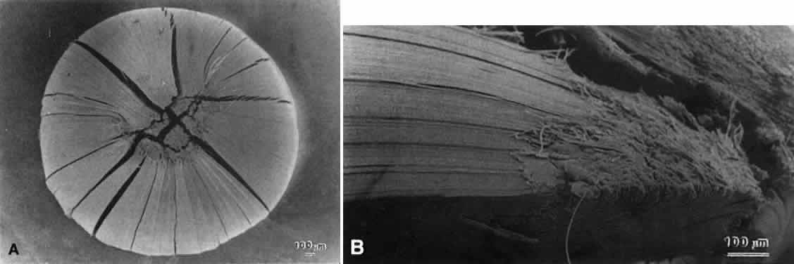 progression. It generally is believed that all PSCs are characterized by a proliferation of dysplastic transitional zone lens epithelial cells.15–18 Transitional zone cells are normally high columnar cells that already have assumed the uniform hexagonal cross-sectional profiles that are maintained after fiber terminal differentiation. These cells normally are arrayed in ordered meridional rows just above the lens equator. As lens growth proceeds, these cells rotate 90° along their polar axis while simultaneously beginning the process of bidirectional elongation to become fiber cells. These dynamic events occur in the bow region of the lens, which can be shown to advantage in polar histologic sections. In the earliest forms of PSCs, the meridional rows are uncharacteristically disorganized. As PSC formation proceeds, the transitional cells either rotate incompletely or not at all in the bow region. These cells then are believed to migrate progressively toward the posterior pole while simultaneously enlarging into ovate-shaped Wedl or bladder cells.18 PSCs often are seen overlain by additional strata of relatively normal elongating fiber cells. Ultrastructurally, the opaque regions of PSCs feature few organelles, degenerating nuclei, elaboration of crystallin proteins, a prominent cytoskeleton, and lateral membrane interdigitations between neighboring cells. Thus, the cataract cells of PSCs are considered to be characterized by dysplastic fibers that exhibit cellular alterations consistent with fiber terminal differentiation. PSCs appear to have a preferential migration path that is associated with the lens sutures. Retroillumination slit-lamp images often reveal an asymmetrical stellate pattern of PSCs that is consistent with the continuously evolving star and asymmetrical star lens sutures that are formed as a function of age. In a recent study19 of Royal College of Surgeons (RCS) rats, an animal model of autosomal recessive retinitis pigmentosa, correlative light, scanning, and transmission electron microscopic analysis clearly demonstrated that the posterior subcapsular opacity is the result of abnormal posterior suture formation rather than a proliferation of dysplastic transitional zone lens epithelial cells (Figs. 7 and 8). The RCS rat PSC is composed of markedly enlarged and irregular posterior fiber ends aberrantly curved away from the polar axis toward the vitreous rather than overlapping and abutting to form suture branches within and between concentric growth shells. Light microscopic analysis revealed evidence of progressively more numerous, enlarged, and irregular ovate cellular profiles at the posterior pole. However, there was no evidence of Wedl cells either within the meridional row region or along a migratory path from the equator to the posterior pole at any age. Transmission electron microscopy (TEM) analysis confirmed that the size and abnormal shapes of cellular profiles were consistent with SEM analysis and that nuclei never were observed within the plaque. Preliminary studies of transgenic mice developed as a model for autosomal dominant retinitis pigmentosa show PSCs resulting from sutural compromise and again give no indication of a proliferation of dysplastic transitional zone cells. The results of these studies raise important questions. Are there two types of PSCs, one that involves a proliferation of dysplastic cells and one that involves sutural malformations? Alternatively, are all PSCs a function of abnormal suture formation, a structural compromise that only recently has been elucidated by correlative ultrastructural analysis? Clinically, these issues are relevant because some PSCs have been noted to spontaneously regress and most RCS rat PSCs effect a form of recovery (internalization). These facts suggest that PSCs may be responsive to therapeutic intervention. At the time of surgical removal, the ultrastructure of mature PSCs are not dissimilar to those of mature cortical opacities. They are characterized by fragmentation, swelling, and degeneration of the ends of elongating and superficial cortical lens fibers. In addition, multilamellar membranous bodies in complex patterns also are typical of PSCs. Globules noted in some PSCs are likely to be necrotic fragments of fiber ends. Similar structural alterations frequently are seen in other types of cataracts. Dense bodies, consistent with lysosomal activity, have been found in varying amounts at sites of opacity in PSCs. In addition, acid hydrolases capable of eliminating membrane waste have been found to be localized at lens sutures. The presence of these lytic enzymes is believed to explain the “zone of liquefication” in PSCs. All the structural alterations noted to occur in PSCs are consistent with the theory that PSCs have a dynamic nature, with the lens attempting to repair itself more or less successively as a function of age and severity of PSC. |