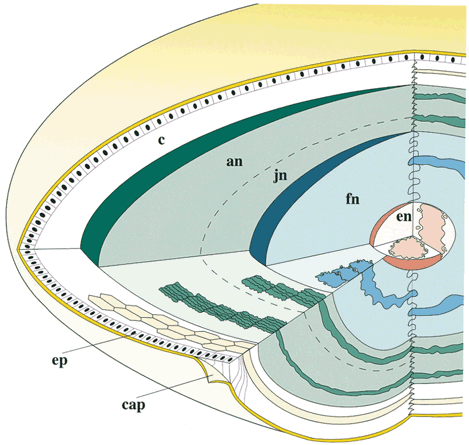 ARCHITECTURE OF THE AGED NUCLEUS Most cataract extractions performed worldwide are due to nuclear opacification. Thus, if we hope to prevent the development or slow the progression of nuclear opacification, we must understand the cellular structure of the different regions of the normal nucleus and how structural changes within these regions cause nuclear cataracts. The regions of the normal (noncataractous) aged human lens and their cellular structure, based on electron microscopic studies,20 are shown in Figure 9. The embryonic, fetal, juvenile, and adult nuclei, as well as “cortex” contain fiber cells, or simply fibers, produced at different rates during specific periods of development, growth and aging (Table 1). The embryonic nucleus, formed by the end of the first 7 weeks of embryogenesis, is the smallest region (up to 400 μm in equatorial diameter) and has the shortest fibers. However, although primary fibers are very irregular in shape, their average cross-sectional dimension, 80 μm2, is larger than in any other region. These cellular features, and the fact that the ends of primary fibers do not overlap to form sutures, distinguish the embryonic nuclear fibers from all subsequently formed secondary fibers. The fibers of the fetal nucleus, formed from 7 weeks until birth, grow at a very high rate and have an average cross-sectional area of 35 μm2. These fibers, only somewhat nonuniform in shape, are packed in short radial cell columns, and as described previously, their ends overlap as Y sutures. Secondary fibers formed after birth until puberty constitute the juvenile nucleus, and those formed after puberty until young adulthood constitute the adult nucleus. These fibers form at a slower rate, are more uniform in shape, and have smaller average cross-sectional areas, 14 and 7 μm2, respectively, partially because of pronounced fiber compaction during aging. As aforementioned, juvenile nuclear fiber ends overlap to form simple star sutures whereas adult nuclear fiber ends overlap to form star sutures. Fibers in the four different nuclear regions also have characteristic age-related structural alterations.20