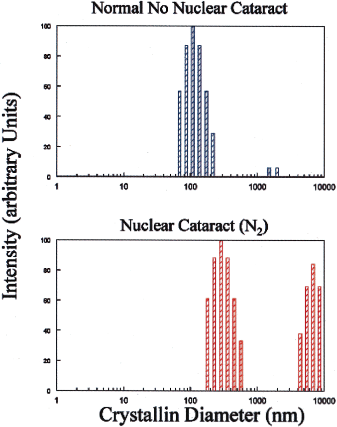 RETROILLUMINATION CAMERAS. Retroillumination cameras49,50 obtain images of cortical and posterior subcapsular cataracts as shown in Figures 1B, 7, and 8. These are useful for both cross-sectional and longitudinal studies. Various manual or automated methods have been developed or are being developed for the analysis of these images to determine the size of opacities. Usually, an artificial mask with a chosen diameter is used to standardize the area of interest in the image, and either a percent area or area in square millimeters is determined. Because of the variability of the background light (the images are shadows of the cataracts using light that is backlighted from the retina or optic nerve), densitometry is unreliable. Among the methods used include computer planimetry, counting boxes, manual and automated edge detection, and automated area analysis. This method is also being used to study IOL decentration and posterior capsular opacification after cataract surgery. Examples of this type of device are the Nidek EAS 1000 retroillumination unit (Nidek, Pasadena, CA), Oxford retroillumination camera (Marcher Ltd., Hereford, UK), and Topcon CTR (Topcon Medical Systems, Paramus, NJ). Other Specialized Slit-Lamp Imaging Systems Various innovators have devised specialized slit-lamp cameras with improved acquisition and image analysis of cataracts. The Laser Slit Lamp (Bausch and Lomb Surgical, San Dimas, CA)60 was developed to measure the density of nuclear cataracts. The Sequential Color Cataract Imaging System,61 provides three lens images for analysis: (1) saggittal sections of the lens, (2) retroillumination images, and (3) images of opacities obtained by direct or side illumination. These devices promise to be useful in clinical studies of the lens and cataracts but may need further development and standardization. In summary, the use of slit and retroillumination imaging coupled with a computerized analysis system is presently the state of the art in objectively measuring cataracts. However, because of the expensive equipment, the extra time, space, labor, and effort required, and limited practical clinical use, these systems are presently used mainly in clinical research settings. The clinical judgment of the ophthalmologist based on the history and eye examination remains the standard in clinical practice. NEW METHODS UNDER DEVELOPMENT New technologies are being applied in the study of cataracts and show great promise for providing new insights into the cataract problem, as well as new devices that a clinician can use with cataract patients in the clinic. In this section, the following devices are discussed: quasielastic or dynamic light scattering (QELS or DLS), magnetic resonance imaging (MRI), spectroscopy, wavefront technology, Raman spectroscopy, autofluorescence, and optical coherence tomography (OCT). These new noninvasive techniques add to the armamentarium available to cataract researchers. Steps being taken to develop these devices for noninvasive clinical use in vivo aim for their possible use on patients for diagnostic purposes in the near future. Quasielastic or Dynamic Light Scattering The intense scattering of light by a cataract arises from a change in the interaction and organization of the constituent particles/lens proteins mediated by lenticular stress. These changes in interaction and organization are reflected in altered motional dynamics (translational and rotational diffusion) of the lens proteins in the cytoplasm. The investigation of lens protein dynamics is being successfully accomplished by the use of DLS.62 DLS is an established laboratory technique to measure the average size or size distribution of microscopic particles (3 nm to 3 μm) suspended in a fluid medium in which they undergo random Brownian (or thermal) motion. Intensity of light scattered by the particles from a laser beam passing through such a dispersion will fluctuate in proportion to the Brownian motion of the particles. Because the size of the particles influences their Brownian motion, analysis of the fluctuations in scattered light intensity yields a distribution of the diffusion coefficient(s) of the suspended particles from which average particle size or particle size distribution can be extracted. In these experiments, visible light from a laser is focused into a small scattering volume inside a sample. The scattered light is collected using a photodetector (photomultiplier tube or an avalanche photodiode) and is processed via a correlator that yields a time correlation function (TCF). For dilute dispersions of spherical particles, the slope of TCF provides a quick and accurate determination of the particle's translational diffusion coefficient. This can then be correlated to the size of particles in the solution via a Stokes-Einstein equation, provided the viscosity of the suspending fluid, its temperature, and its refractive index are known.62-66 The distribution of particle size obtained from the tissues examined (such as the lens) can then be plotted (Figs. 10 and 11).