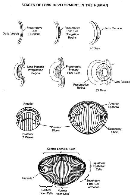 cause. Defined by age at onset, a congenital or infantile cataract is visible in the first year of life, a juvenile cataract occurs in the first decade of life, a presenile cataract occurs before the age of 45 years, and the so-called senile or age-related cataract occurs thereafter. The age of onset of a cataract does not necessarily indicate its cause. Congenital cataracts may be hereditary or secondary to a noxious intrauterine event. Cataracts associated with a systemic or genetic disease may not occur until the second or third decade (e.g., cataracts associated with retinitis pigmentosa). Even age-related cataract, thought to be due to multiple insults accumulated over many years, have a genetic component, making certain persons more vulnerable to the environmental insults. Several classification systems have been developed based on the anatomic location of the opacity. In an attempt to deal with congenital cataract, Merin43 proposed a system based on morphologic classification: the cataract is classified as total (mature or complete), polar (anterior or posterior), zonular (nuclear, lamellar, sutural), and capsular or membranous. Because, as discussed above, lens development follows a well-documented timed sequence, the location of a lens opacity provides information about the time at which the pathologic process intervened, thereby helping to determine the cause. Nuclear opacities from the most central region outward denote cataract formation occurring at the time of the development of that portion of the involved lens nucleus—embryonic (first 3 months), fetal (third to eighth month), infantile (after birth), or adult. Because the lens fibers are laid down constantly throughout life, lens opacities that develop postnatally present as cortical opacities or appear just beneath the posterior lens capsule as subcapsular opacities—for example, cataracts caused by topical steroid drugs and radiation. Polar opacities involve either the anterior or posterior pole of the lens and may include the posterior subcapsular lens cortex extending to the lens capsule (Fig. 2). Posterior subcapsular cataracts can also occur secondary to a variety of insults. Although they have been associated with proliferation of dysplastic bladder-like fiber cells called Wedl cells, at least some posterior subcapsular cataracts appear to be due to abnormalities of the posterior fiber ends.44 When both anterior and posterior poles are involved, the term bipolar is used. Isolated anterior polar cataracts are usually small, bilateral, and nonprogressive and do not impair vision. They may be inherited as an autosomal dominant trait45 or may be associated with microphthalmos, persistent pupillary membrane, or anterior lenticonus. Posterior polar cataracts also may be inherited as a dominant trait46 or may be sporadic and unilateral; they can be associated with abnormalities of the posterior capsule, including lentiglobus or lenticonus, or with remnants of the tunica vasculosa. Although usually stable over time, they may progress and can be associated with capsular fragility. Nuclear cataracts show opacities in the fetal or fetal and embryonic lens nucleus (Fig. 3). They can show a wide variation in severity, from dense opaci-ties involving the entire nucleus to pulverulent (or dusty-appearing) cataracts involving only the central nucleus or discrete layers (see below). Lamellar cataracts (see Fig. 3) affect lens fibers that are formed at the same time, resulting in a shell-like opacity at the level at which the fibers were laid down at the time of the presumed insult. They are the most common type of congenital cataract and may be inherited in a dominant fashion.47–52 Some cataracts have associated arcuate opacities in the cortex called cortical riders. Sutural or stellate cataracts (Fig. 4) affect the regions of the fetal nucleus on which the ends (or feet) of the lens fibers converge, called the Y sutures. These are visible by slit-lamp biomicroscopy as an upright Y anteriorly and an inverted Y posteriorly, even in normal lenses. Theories of cataract development53 suggest that abnormalities in lens fiber development or maturation may predispose to cataract development later in life. This is supported by examples in animals (the Philly mouse) and in humans (gyrate atrophy).54 Sutural cataracts can also be inherited as autosomal dominant traits.47 Cerulean or blue dot cataracts are characterized by numerous small bluish opacities in the cortical and nuclear areas of the lens.52