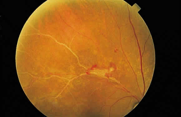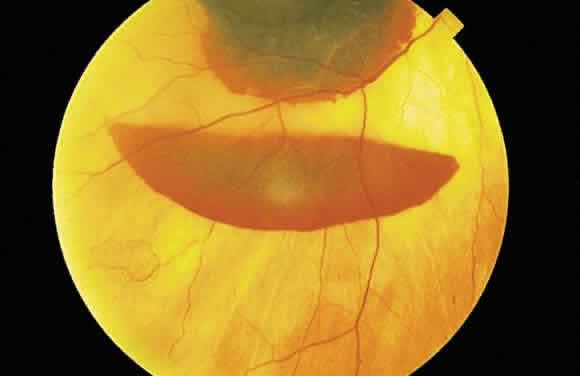 shape of the hemorrhage. Fresh hemorrhage on the retinal surface appears bright red, whereas fresh hemorrhage