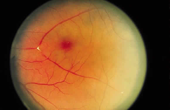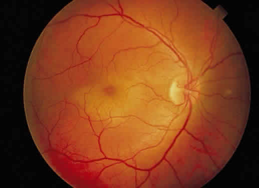 The pink color of the normal optic nerve head is reflective of the vascular supply to the surface of the disc. Loss of the vascularity or replacement of the neural tissue by opaque glial tissue alters the color of the disc (Fig. 7). Anatomical variations in the retina alter the appearance of lesions, in particular, the macula and the retinal periphery. The macular cytoarchitecture differs in that the ganglion cell layer and nerve fiber layers are displaced centrifugally from the fovea. Therefore, on ophthalmoscopic examination, conditions that affect these layers are not apparent in the fovea. Tay-Sachs disease involves the accumulation of storage material by ganglion cells. Since these cells are not present in the fovea and the presence of the storage material opacifies the normally transparent retinal tissue, the retina surrounding the fovea is opacified, but the fovea transmits the normal choroidal color (red), accounting for the presence of the “cherry-red spot” in this condition. Notice that the opacification (white appearance) of the perifoveal retina is not seen beyond the macula. The reduced concentration of ganglion cells in the extramacular retina explains the focal nature of this retinal opacification (Fig. 8). The oblique orientation of the outer plexiform layer (connection of rods and cones to the bipolar layer) in the macula explains the appearance of several lesions. Cyst-like spaces may occur at the level of the outer plexiform layer of the macula (Henle's layer) as the result of the accumulation of fluid or the hydropic swelling of Müller cells with subsequent disruption and the formation of the spaces.1,2 These cyst-like spaces (they are not lined by an epithelium and are therefore not designated as true cysts) are oriented along the plane of Henle's layer and appear to originate from a central zone (Fig. 9), like the petals of a flower. The fluorescein angiographic appearance of cystoid macular edema is frequently described as having a petaloid pattern3 (Fig. 10).
