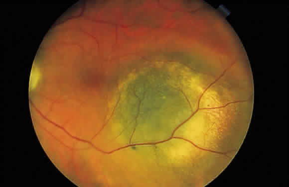 Necrotic retina has a white appearance. Necrosis may result from a variety of inflammatory conditions, including viral, fungal, and protozoal (Toxoplasma) retinitis. Each type of retinitis appears, in part, as a white retinal lesion. Cytomegalovirus retinitis (Fig. 24) resembles a pizza pie with an admixture of white (retinal inflammation) and red (hemorrhage) colors (Fig. 25). The retinal abscesses of fungal retinitis are white. Likewise, the satellite lesion of retinochoroiditis caused by active Toxoplasma (the choroidal inflammation is merely in response to the primary retinal infection) is white (Fig. 26). The white appearance of a lesion from inactive Toxoplasma results from the destruction of neurosensory retina, retinal pigment epithelium, and choroid to permit a direct view of the sclera (Fig. 27). Necrosis in retinal-derived neoplasms is white; the appearance of regressed (necrotic) retinoblastoma often is described as “cottage cheese.”10