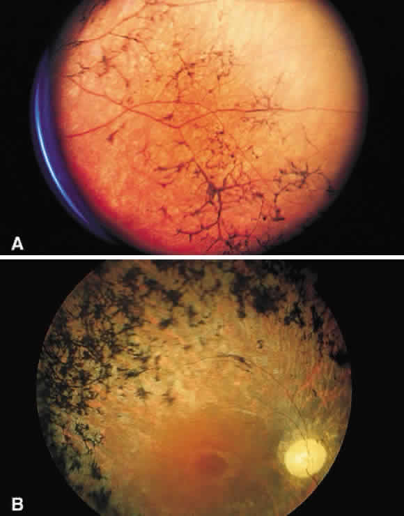 The shape of other retinal hemorrhages depends on the layer of the retina affected. The hemorrhage spreads along the plane defined by the orientation of retinal structures. Thus, a hemorrhage within the nerve fiber layer is oriented in the direction of the nerve fibers, parallel to the internal limiting membrane (seeFig. 11A) and is seen in the posterior pole as a flame-shaped hemorrhage (see Fig. 11B). In the retinal periphery, however, nerve fiber layer hemorrhages are not flame shaped but appear ophthalmoscopically as dots or blots. The explanation of this phenomenon also is related to the orientation of the nerve fiber layer. In the retinal periphery, the nerve fibers become separated and are oriented so as to form a network of round or polygonal spaces between the fibers, whereas in the posterior pole, the tight fascicular orientation of the fibers forms potential trough-like planes. The orientation of the processes of retinal cells deep to the nerve fiber layer is perpendicular to the plane of the internal limiting membrane. Therefore, hemorrhages in the deeper (or outermost) retinal layer are oriented in a cylindrical column. The ophthalmoscopist views a cross-section of this column (the cylinder end-on) and sees a dot or blot hemorrhage (see Fig. 23). |