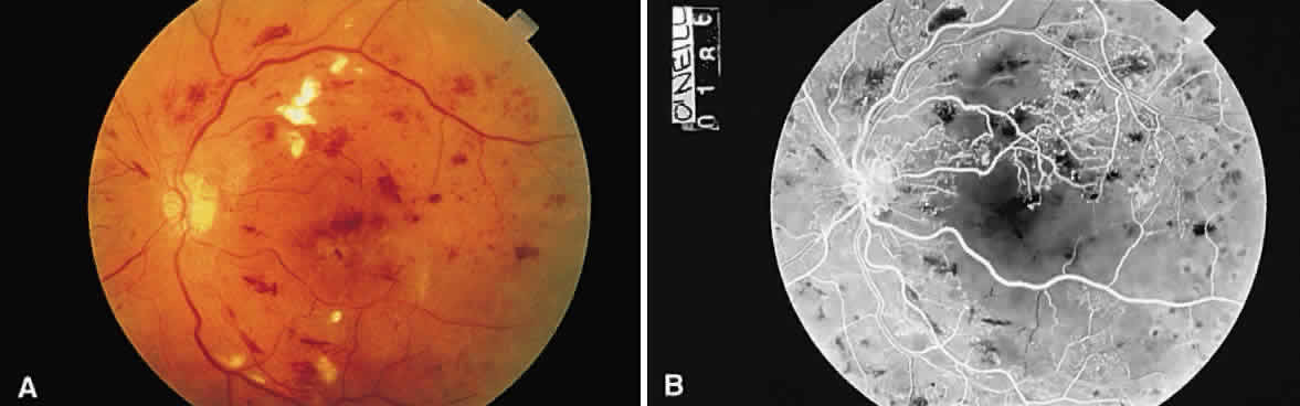 Fibrous tissue may originate from the choroid and proliferate through breaks in Bruch's membrane into the subpigment epithelial or subretinal spaces,4 hence the white appearance of disciform macular degeneration (Fig. 16). Fibrous tissue also may originate from fibroblasts located in the adventitia of retinal vessels and may contribute to the white appearance of vascularized membranes (Fig. 17A), such as those seen in proliferative diabetic retinopathy (see Fig. 17B) or arterioles after vascular occlusion (see Fig. 6). The accretion of collagen in the wall of the vessel in arteriolosclerosis may thicken the vessel wall (see Fig. 5) and alter the color of the blood column to a copper or silver color. Injury to the pigment epithelium results in scar formation (Fig. 18). Collagen deposition from pigment epithelium metaplasia may be identified by the presence of pigment within a scar (Fig. 19). Injured nonpigmented epithelium may undergo similar fibrous metaplasia and may contribute to the formation of membranes such as cyclitic membranes in the region of the ciliary body.