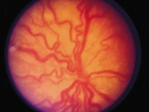 reflex must be considered. The clinical setting often provides the diagnosis. Infants with ROP typically were premature and of low birth weight with a history of variable oxygen exposure. There is no hereditary pattern. Familial exudative vitreoretinopathy usually is an autosomal dominant peripheral fundus disorder that is asymptomatic in 80% of cases. It also may be inherited in an X-linked fashion, in which case Norrie's disease must be included in the differential diagnosis, since one mutation in the Norrie disease protein gene (NDA) may lead to confusion with FEVR. Peripheral nonvascularization with straightening and anastomosis of the vessels occurs in a fibrillar pattern at the junction between perfused and nonperfused retina, and there may be dragging of the retina. Regression, such as occurs in ROP, typically does not occur in familial exudative vitreoretinopathy. The peripheral retina remains avascular, but progression to more severe changes such as tractional retinal detachment and neovascular glaucoma may occur.124 Patients with familial exudative vitreoretinopathy are normally full term at birth with no history of respiratory difficulties and supplemental oxygen exposure. If familial exudative vitreoretinopathy is suspected in an older child or adult, examination of asymptomatic family members often reveals peripheral fundus lesions. Incontinentia pigmenti (Bloch-Sulzberger syndrome) is an X-linked dominant condition that may simulate ROP in female infants. The disease is lethal in male infants. In the first month, infants may have dilated, tortuous retinal vessels with peripheral retinal nonperfusion. Hemorrhage may be present at the junction of vascularized and avascularized retina. Other ocular anomalies include strabismus, cataract, myopia, nystagmus, blue sclera, and corneal opacities. Vesicular skin eruptions, which later turn into depigmented areas, are seen. Central nervous system disorders include seizures, spastic paralysis, mental retardation, and cortical blindness. Patients with X-linked retinoschisis may develop a dragged retina in the first year of life. The dragging may be associated with vitreous hemorrhage. Examination of the fellow eye and electroretinography (showing a decreased b wave) are helpful in making the diagnosis. Family history frequently is positive. The differential diagnosis of stage 5 ROP is that of a white pupillary reflex (leukocoria). This includes congenital cataract, fetal vasculature, retinoblastoma, ocular toxocariasis, intermediate uveitis, Coats' disease, advanced X-linked retinoschisis, and vitreous hemorrhage. |