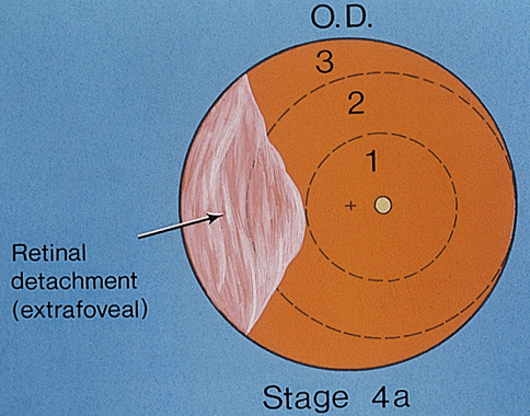 To define location, the retina was divided into three zones with the optic nerve as the center, since retinal vascular growth proceeds from the disc toward the ora serrata (Fig. 2). Zone I consists of a circle, the radius of which extends from the disc to twice the distance from the disc to the center of the macula (twice the disc-fovea distance in all directions from the optic disc). Zone II extends from the edge of zone I peripherally to a point tangential to the nasal ora serrata and around to an area near the temporal anatomic equator. Zone III is the residual temporal crescent of retina anterior to zone II. This is the zone that is vascularized last in the premature eye, and it is the zone most frequently involved with ROP. The extent of disease is specified as hours of the clock (see Fig. 2). The second parameter specified in the 1984 classification is staging of the disease, that is, the degree of abnormal vascular response observed. Four stages were recognized, and staging for the eye as a whole receives the stage of the most severe manifestation of ROP present. Stage 1 (demarcation line) is defined as a thin but definite structure that separates avascular retina anteriorly from the vascularized retina posteriorly. Abnormal branching or arcading vessels are seen leading up to the line. It is flat and white and is in the plane of the retina. Stage 2 (ridge) is present when the line of stage 1 has grown, has height and width, and occupies a volume extending up out of the plane of the retina. The ridge may be pink or white, and vessels may leave the plane of the retina to enter it. Small tufts of new vessels may be seen on the surface of the retina posterior to the ridge. These vessels do not constitute fibrovascular growth, which is a necessary condition for stage 3 ROP. Stage 3 (ridge with extraretinal fibrovascular proliferation) exists when extraretinal fibrovascular proliferation is added to the ridge of stage 2 ROP (Fig. 3). Stage 3 is arbitrarily further subdivided into mild, moderate, and severe. Stage 4 (retinal detachment) is the addition of retinal detachment to stage 3 findings. Traction or exudation cause the retinal detachment. Progressive vascular incompetence, occurring with the changes at the edge of the abnormally developing retinal vasculature, is noted by increasing dilation and tortuosity of the peripheral retinal vessels, iris vascular engorgement, pupillary rigidity, and vitreous haze. When the vascular changes are so marked that the posterior veins are enlarged and the arterioles are tortuous, a plus sign is added to the ROP stage number (Fig. 4). Subsequent to the initial ICROP report, completion of the classification of ROP led to the publication of the classification of retinal detachment.41 Stage 4 was expanded to stage 4A and 4B. Stage 4A (Fig. 5) represents extrafoveal retinal detachment, which is a concave traction type of retinal detachment in the periphery without involvement of the macula. These detachments generally are located in anterior zone II or III. Stage 4B (Fig. 6) is a partial retinal detachment including the fovea, which usually extends in the form of a fold from the disc through zone I to involve zones II and III. Stage 5 retinal detachments are total and always funnel shaped. Stage 5 is subdivided based on the shape of the funnel. The funnel is divided into anterior and posterior parts, allowing for four subdivisions, depending on whether the funnel is open or narrow in both parts of the funnel. Although regression was not part of the classification, the committee recognizes that it is the most common outcome of ROP. The various patterns of regression were believed to be too numerous to classify; they are listed in (Table 1).