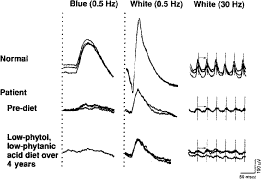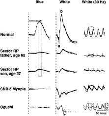 stages of retinitis pigmentosa. The previous classification of these diseases was based on the family of origin (e.g., Nougaret type), by the original description of the ERG waveforms associated with the condition (e.g., Riggs type or Schubert-Bornschein), or by the ophthalmologist who first described the disease (e.g., Oguchi disease). These diseases are now being reclassified by molecular genetic analysis.247 Missense mutations in three different genes encoding members of the rod phototransduction cascade have been reported to cause dominantly inherited stationary night blindness. Specifically, the mutations are the Ala292Glu and Gly90Asp mutations in rhodopsin,248,249 the His258Asp mutation in the β-subunit of rod phosphodiesterase,250 and the Gly38Asp mutation in the α-subunit of rod transducin.251 The latter mutation has only been seen in the descendants of Jean Nougaret. Although the Ala292Gly rhodopsin mutation apparently causes a complete loss of rod function (i.e., Riggs type),248 the other mutations cause an incomplete loss of rod function.251,252 Some evidence exists from psychophysical and ERG testing that the rods are constitutively active in the dark in some forms of stationary night blindness. This has been suggested for patients with the rhodopsin, Gly90Asp mutation.249 The ERG abnormalities in patients with the Gly38Asp mutation in the α-subunit of rod transducin can be simulated by light adapting the normal retina, compatible with the idea that these patients have mutant rod transducin that is constitutively active in the dark.252 Further evidence that these patients have rod photoreceptors despite their night blindness is provided by fundus reflectometry studies that have shown normal levels of rhodopsin and normal rhodopsin kinetics.253 Oguchi disease is a recessively inherited form of stationary night blindness. Following 1 hour of dark adaptation, patients with Oguchi disease have no rod b-wave in response to dim blue light flashes, a cornea-negative response to white light, and a normal cone response to 30-Hz white flicker. Following complete dark adaptation after 12 hours, some patients have a normal rod b-wave amplitude and normal rod b-wave implicit time but only in response to one or two flashes of light.254 Apparently the test flash used to elicit the ERG, although relatively dim, can be intense enough to light adapt the rod system. Molecular genetic analyses have shown a null mutation, Asn309(1-bp del), in the gene encoding arrestin in some patients of Japanese descent.255 Several null mutations have also been described in the gene encoding rhodopsin kinase in some patients of Eastern European descent.256 Both arrestin and rhodopsin kinase participate in the deactivation of photoactivated rhodopsin. The lack of either arrestin or rhodopsin kinase would be expected to have the same physiologic effect, namely the prolongation of photoactivated rhodopsin with a consequent abnormality in rod sensitivity. Fundus albipunctatus is another form of recessively inherited stationary night blindness.257,258 Patients with fundus albipunctatus have a delay in rod visual pigment and foveal cone pigment regeneration, as monitored with fundus reflectometry.257 Changes in visual pigment levels parallel the prolonged cone and rod limbs of the dark-adaptation curve. Full-field ERGs have been found to be normal with respect to both cone and rod amplitudes and b-wave implicit times after full dark adaptation.258 The findings in fundus albipunctatus suggest an abnormality in visual pigment regeneration secondary to some abnormality in the relationship between the photoreceptors and the pigment epithelium. The composition of the yellow-white lesions and their relationship to the abnormality in visual pigment regeneration are not known. Patients with this condition have been observed to have defects in the gene encoding 11-cis retinol dehydrogenase.259 A form of stationary night blindness for which the precise gene defect remains unknown is congenital nyctalopia with myopia. This condition (i.e., Schubert-Bornschein type) is inherited by either an X-linked or autosomal recessive mode.260–262 The extent of the myopia is characteristically -3.5 to -14.5 diopters (D). Patients cannot attain normal dark-adapted rod thresholds and have fundus findings of myopia. Their rod ERG b-wave responses to dim blue light are nondetectable, and the patients have a characteristic cornea-negative response to white light in the dark-adapted state and normal or nearly normal cone responses to 30-Hz white flicker. The preservation of the a-wave from the rod photoreceptors with loss of the b-wave from neurons proximal to the photoreceptors suggests some abnormality in intraretinal transmission of the response from the rod photoreceptors to proximal retinal cells. ERG amplitudes are reduced in congenital nyctalopia with myopia compared with those from normal emmetropes; this probably occurs because of the known reductions of ERG amplitude seen in patients with moderate axial myopia as the only finding.263 The ERG abnormality in congenital nyctalopia with myopia has been reported as an acquired defect in patients with cutaneous malignant melanoma, who have an acute onset of night blindness with selective reduction in the rod b-wave response264 (Fig. 18). Development of an antibody to the melanoma that also reacts to retinal cells with an interruption in rod signal transmission has been considered as a probable mechanism to account for the sudden onset of night blindness in patients with this paraneoplastic retinopathy. Patients with congenital nyctalopia have been further subdivided into two groups designated as the complete or incomplete form of the condition based on dark-adaptation measures and ERG amplitudes. In the complete form, the rod a-wave is normal, whereas the rod b-wave is absent and responses are mediated by the cone system. In the incomplete form, rod ERG responses, although reduced in am