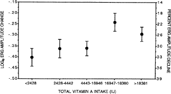 Of the more than 25 genes so far found to be causes of retinitis pigmentosa, some are known to play a role in the phototransduction cascade in rod photoreceptors (e.g., rhodopsin, the α- and β-subunits of rod cyclic guanosine monophosphate-phosphodiesterase (cGMP-PDE), the α-subunit of the rod cGMP gated channel, and arrestin). Other genes are thought to encode structural proteins in the outer segments (peripherin/RDS and ROM1). Others are involved in the recycling of vitamin A (CRALBP, RPE65, LRAT, and ABCA4). Some genes encode transcription factors (NRL and NR2E3) or proteins involved in the escort of opsin from the inner to the outer segment (RPGR and TULP1). The more than 25 genes (see Table 2) account for about 50% to 60% of cases of retinitis pigmentosa in the United States. It should be noted that defects in the same gene can result in different phenotypes; for example, most rhodopsin mutations lead to retinitis pigmentosa, but some cause stationary night blindness. Defects in the ABCA4 gene can result in juvenile macular degeneration or a generalized cone-rod degeneration. Some mutations in the USH2A gene lead to retinitis pigmentosa with partial hearing loss, whereas another mutation in the same gene results in only retinitis pigmentosa. Variable clinical expression can exist among patients with the same gene defect, suggesting that factors other than the gene defect itself (e.g., diet, environment, modifier genes) affect the course of the disease with possible implications for therapy. TREATMENT TRIALS Many treatments have been attempted for the common forms of retinitis pigmentosa including various vitamins and minerals, vasodilators, tissue therapy with placental extract, cortisone, cervical sympathectomy, injections of a hydrolysate of yeast ribonucleic acid (RNA), ultrasound, transfer factor, dimethyl sulfoxide (DMSO), ozone, muscle transplants, and subretinal injections of fetal retinal cells.88–95 None of these has been shown to have proven therapeutic benefit. A study of patients evaluated before and after receiving electric stimulation, autotransfused ozonated blood, and ocular surgery in Cuba showed that this intervention provided no benefit and raised the possibility that this intervention was aggravating the course of the disease.95 None of these attempts at treatment was conducted with a randomized, controlled, double-masked protocol, which is necessary to avoid possible patient or examiner biases. Most of these studies were performed without electroretinographic data as an end point for evaluating efficacy, so that the amount of remaining retinal function could not be quantitated in an objective manner. Claims of success with one or another treatment for patients with retinitis pigmentosa that are based solely on subjective reporting of improved visual function are to be interpreted with caution. Spontaneous fluctuations in visual acuity and visual field are well known in this condition. Given the slow course of retinitis pigmentosa without treatment, it will usually require several years to assess whether or not any proposed treatment has an effect on stabilizing or slowing the course of the disease. The problem of assessing treatments may be further complicated by the genetic heterogeneity of this condition and the stage of disease at which treatment is initiated. The common forms of retinitis pigmentosa have now yielded to treatment. In a randomized, controlled, double-masked trial among 601 patients ages 18 to 49, the course of retinal degeneration as monitored by the ERG was slower on average among patients taking a daily supplement of vitamin A palmitate, 15,000 IU/day, than among those not on this dose. Furthermore, the course appeared to be faster on average among patients taking a daily supplement of 400 IU/day of vitamin E than those not on this dose.96 Among a subset of 125 patients who could perform visual field testing with great precision, those on vitamin A showed a slower rate of decline of visual field than those in the control group.97 The optimal total intake of vitamin A palmitate in this study population appeared to be approximately 18,000 IU/day (i.e., 3000 IU of vitamin A in a regular diet and 15,000 IU/day of vitamin A as a supplement); higher intake did not provide greater benefit (Fig. 9). These findings have led to the recommendation that most adult patients with the common forms of retinitis pigmentosa should take a daily supplement of 15,000 IU of vitamin A in the palmitate form under the supervision of their ophthalmologist and avoid high-dose supplementation with vitamin E. For the average patient in the trial, it has been estimated that treatment with vitamin A could add 7 additional years of useful vision96; that is, the average patient with 1.3 μV of cone function who starts vitamin A at age 32 would retain useful vision until age 70 rather than age 63 if left untreated. For some patients with larger pretreatment ERGs, vitamin A supplementation could make the difference whereby these patients retain some vision for their entire lives. Vitamin A may provide its benefit through the rescue of remaining cones, thereby, explaining how one supplement can help patients with many different rod-specific gene defects. The daily intake of a vitamin A supplement may provide protection against possible transient decreases in serum retinol concentrations that may adversely affect photoreceptor function. With respect to vitamin E, it has been hypothesized that a daily dose of 400 IU may adversely affect the course of retinitis pigmentosa at least in part by inhibiting the absorption or transport of vitamin A, because it was observed that the patients receiving vitamin E had slight but significant decreases in serum retinol concentration compared with those not receiving vitamin E.96 Because doses greater than 25,000 IU/day of preformed vitamin A can be associated with liver disease when taken over the long term, patients should have a fasti