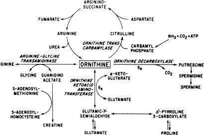 Patients have plasma ornithine concentrations elevated ten- to twenty-fold207,208 because of a deficiency of ornithine-ketoacid-amino-transferase (OAT) activity (Fig. 16).209–211 Affected individuals cannot convert ornithine to pyrroline-5-carboxylic acid (PCA); this deficiency can be detected in extracts of cultured skin fibroblasts. Patients have virtually no OAT activity, and carrier parents have a partial deficiency. Plasma lysine212 and glutamate and glutamine,213 as well as serum and urine creatine,214 have also been found to be reduced. More than 60 mutations have been discovered in the OAT gene on chromosome 10 in affected patients.215–218