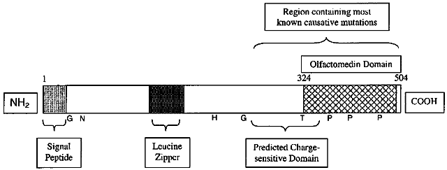 pathophysiologic processes of different timing and severity. EVIDENCE FROM EPIDEMIOLOGY Epidemiologic studies have confirmed the clinical observation that open-angle glaucoma is more likely to occur in people who have relatives with open-angle glaucoma. Familial forms of primary open-angle glaucoma have been estimated at anywhere from 5.6% to 47% of all primary open-angle glaucoma cases.17–23 The great variation in apparent frequency of familial glaucoma in these studies may in some cases reflect underlying genetic differences in the populations being studied but may also reflect methodologic differences, ascertainment bias, or variation in inclusion criteria and/or the parameters being used to define affected status. Additional inaccuracy in any attempt to gauge frequency of familial glaucoma cases arises because glaucoma frequently is present only later in life and may not have yet developed in some patients who will eventually be affected. Bias in the direction of overreporting may occur in patients who report family history when the relatives in fact have ocular hypertension or a completely different form of glaucoma. A recent study of very large families in Tasmania indicates that underreporting can occur even when the family history of glaucoma is strong, because individuals diagnosed with primary open-angle glaucoma may be unaware of the presence of glaucoma among their relatives.24 The Tasmania study points to a need to encourage affected individuals to communicate with their relatives about the existence of glaucoma in the family. Twin studies also support the existence of a genetic component to open-angle glaucoma.25–27 One recent study that took age-related prevalence of glaucoma into account found 98.0% concordance among monozygotic twins age 55 or over.27 Twin studies have also provided evidence for genetic components to the optic cup diameter,28 optic disc diameter,29 cup:disc ratio,30 and anterior chamber depth.27 Finally, the idea of genetic components to glaucoma is supported by observations on differential prevalence of particular forms of glaucoma in particular racial or ethnic groups. Open-angle glaucoma is clearly found more often in African Americans than in whites.13 Open-angle glaucoma is less common than angle-closure glaucoma in Innuit and Asian populations.31–36 MYOC (GLC1A) Genetics Open-angle glaucoma caused by mutations at the MYOC gene (previously, the GLC1A locus) is generally inherited in an autosomal dominant fashion. Patients often have signs of elevated intraocular pressure, optic nerve cupping, and glaucomatous visual field loss within the first 3 decades of life.37 Sheffield and colleagues reported linkage of glaucoma to chromosome 1q38 and subsequent reports by this and other groups helped refine localization of the gene.39–42 After narrowing this locus further, Stone and partners reported use of a positional candidate gene approach to identify three distinct mutations in five of eight families with 1q-linked juvenile-onset glaucoma in a gene called the trabecular meshwork (TM)-inducible glucocorticoid response (TIGR) gene.43 Two of these mutations (Gly364Val and Gln368STOP) were found in 10 of 227 (4.4%) adult-onset open-angle glaucoma patients who had at least one living first-degree relative with a documented history of glaucoma. In addition, three of 103 (2.9%) unselected patients with open-angle glaucoma also harbored a Gln368STOP mutation, as did one of 380 people from the general population tested. Additional mutations, many of which cluster in the C-terminal domain, have since been reported in GLC1A families from around the world.37,44–51 Efforts to follow and understand the literature are helped by understanding the revisions that have taken place in the nomenclature of this gene. Before mutations were found in these families, the classification GLC1A was used to designate the first genetically-defined locus mapped for open-angle glaucoma. The gene that Stone and colleagues found mutated in these families, however, had already been identified as a candidate glaucoma gene based on a cellular pharmacology model and named TIGR (for TM-inducible glucocorticoid response protein) by Polansky and colleagues.52,53 Working independently, Kubota and colleagues cloned a gene for a cytoskeleton-associated protein from human retina that they named myocilin (MYOC) because of its homology to myosin and its localization to the cilium of the photoreceptor.54 However, MYOC was, unbeknown to them, in fact, the TIGR gene. In addition, during their studies of genes expressed by human ciliary body, Ortega and colleagues had deposited short stretches of the TIGR sequence into the Genbank sequence repository as anonymous expressed sequence tags.55 The official name of this gene and locus, as recognized by the HUGO Nomenclature Committee, is MYOC, but GLC1A, TIGR, and TIGR/MYOC are still frequently used in the literature. Molecular Biology and Pathogenesis The mechanism by which sequence changes in the myocilin protein causes glaucoma is unclear. Studying the normal functions of this protein, however, may help in understanding disease pathogenesis. The MYOC gene codes for the 504 amino acid, 55 kDa myocilin protein.53,54 Its sequence includes several domains (Fig. 1): (1) a hydrophobic amino-terminal domain with homology to nonmuscle myosin heavy chain, (2) a leucine zipper domain, possibly important in protein-protein interactions, and (3) a domain near the carboxy-terminus with homology to an olfactory epithelium-specific extracellular protein, olfactomedin, where many reported mutations cluster.53,54,56 Rozsa and colleagues have proposed the existence of an apparent charge-sensitive domain between the leucine zipper and the olfactomedin homology domain.47,49 Potential phosphorylation and glycosylation sites also exist, although Huang and colleagues did not detect glycosylated protein in human ocular tissues.57