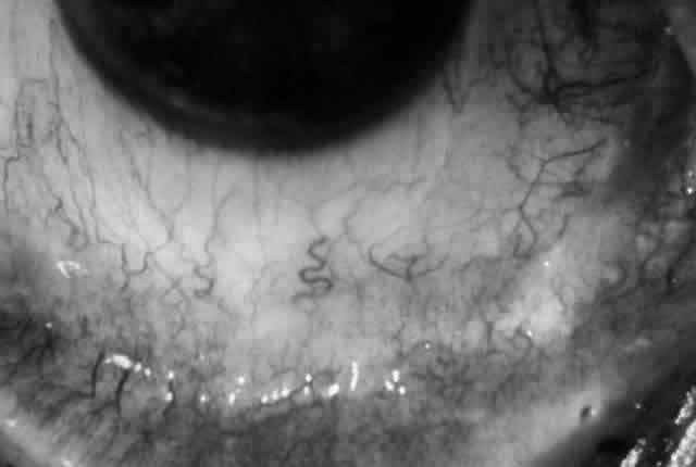Ocular Manifestations Clinically, the ocular disease in cicatricial pemphigoid (OCP) may present unilaterally in the form of a chronic, recurrent catarrhal conjunctivitis, but it eventually becomes bilateral. Subepithelial fibrosis is characteristic of stage 1 of OCP (Fig. 7). Stage 2 shows fornix foreshortening (Fig. 8), and symblepharon formation is the hallmark of stage 3 (Fig. 9). Stage 4, end-stage disease, is characterized by ankyloblepharon and surface keratinization (Fig. 10). Obstruction of the lacrimal ductules and meibomian gland ducts eventually produces an unstable tear film and progressive sicca syndrome, but it is to be emphasized that OCP is not a dry-eye syndrome until late in the disease course.20 Trichiasis and entropion occur because of the subepithelial fibrosis, with eventual keratopathy, corneal neovascularization, and corneal ulceration and scarring.20