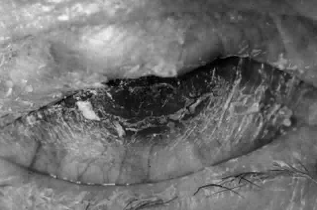 Epidemiology SJS, although it has no racial or geographic predilection, occurs in young males more commonly than in other groups of individuals, with winter and spring seasonal peaks.67 The disease is relatively common, accounting for up to 1% of dermatologic outpatient visits.68,69 Pathogenesis Histologically, the skin lesions exhibit diffuse inflammatory infiltration and edema of the dermis. When bullae are present, they are subepidermal in location and without acantholysis.66 The exact pathogenetic mechanism of this disease is unknown; autoimmune, infective, and allergic factors have all been considered possible causes. Most evidence now favors a hypersensitivity to microbes and drugs.70 Erythema multiforme has been associated with various bacterial (especially Mycoplasma pneumoniae), viral (especially herpes simplex virus), mycotic, and protozoan infections, with drugs and vaccines, with allergic contactants, with collagen disorders, and with internal malignancies. Some of the incriminated precipitating drugs include sulfonamides, tetracyclines, penicillin, bromides, iodides, salicylates, phenytoin sodium, barbiturates, phenylbutazone and other nonsteroidal antiinflammatory drugs, cortisone, and vaccines against polio, smallpox, influenza, diphtheria, and tetanus. The development of or exacerbation of Stevens-Johnson syndrome has been reported after ophthalmic application of proparacaine,71 sulfonamide,72 tropicamide,73 and scopolamine.73 Herpes simplex virus (HSV) is a vastly underappreciated cause of EM,74 with 15% to 63% of cases associated with this virus.75,76 Recurrent EM is especially associated with recurrent HSV infection,77 and herpes simplex virus has been isolated from the skin lesions of erythema multiforme.78 The results of our research,79 as well as that of others,80–87 suggest that episodic showers of circulating immune complexes may result in immune complex deposition in previously damaged, predisposed vessels, with resultant immune complex vasculitis/perivasculitis with lymphocyte and neutrophil participation in the vessel damage. Leakage of plasma and cells may progress to subepidermal blister formation and to necrosis of the epidermis over the blister.66 Diagnosis The diagnosis of SJS is not difficult, given the dramatic characteristic skin and mucous membrane lesions. Ocular Manifestations Ocular involvement is common in Stevens-Johnson syndrome, occurring in more than half of patients with this disease.70 The acute ocular manifestations vary from mild mucopurulent conjunctivitis to severe, pseudomembranous conjunctivitis leading to symblepharon, lid scarring, keratoconjunctivitis sicca, corneal ulceration, corneal scarring, and neovascularization. The chronic consequences of SJS depend on the degree of subepithelial fibrosis and tarsal conjunctival keratinization that occurs as a result of the acute exanthem. The former (fibrosis) results in variable degrees of meibomian duct and lacrimal ductule obstruction (with resultant deficient or unstable tear film problems), trichiasis, distichiasis (with resultant chronic abrasive trauma to the cornea), and cicatricial entropion; tarsal conjunctival keratinization results in a chronic sandpapering trauma effect on the cornea with each blink. The combined effects of these external aggravants produce chronic keratopathy, with eventual corneal scarring, neovascularization, or ulceration (Fig. 15). One other chronic, rare ocular manifestation of SJS may develop: recurrent, immunologically mediated conjunctivitis. Just as such recurrent episodes may occur in skin87 and in oral mucosa,88 so too may they occur in conjunctiva.79 The diagnosis of this phenomenon is not easy and depends on eradication of all external aggravants, eliminating these as confounding variables, and then demonstration, by immunohistochemical techniques employed on a biopsy specimen from the inflamed conjunctiva, of a lymphocytic microangiopathy with IgA deposition in the vessels. Herpes simplex virus is one inciting agent for recurrent SJS, and this possibility should be carefully investigated. Therapy Therapy of the acute phase of the ocular disease includes use of topical steroids as well as topical antibiotics applied frequently to combat superinfection, especially that from Staphylococcus aureus and (if the patient is hospitalized in a burn unit) Pseudomonas species. Lubricants should be generously employed, especially if lid involvement has resulted in even mild lagophthalmos. If anterior uveitis is present, mydriatic therapy is appropriate. Howard has pointed out that the pseudomembranes should not be stripped, because doing so leads to bleeding and increased scarring.89 Lid-globe adhesions should be lysed twice daily to maintain the fornices. I use my scleral depressor for this purpose after cleaning it with 70% isopropyl alcohol, having found no advantage to use of a glass rod. In an effort to prevent corneal scarring, Arstikaitis has advocated early tarsorrhaphy before deep stromal vessels invade the cornea.90 This is appropriate in instances of lagophthalmos and persistence of corneal epithelial defects. The chronic phase of ocular involvement in Stevens-Johnson syndrome necessitates caring for the consequences of the acute exanthem: punctal occlusion for sicca syndrome, electro- or cryoepilation for trichiasis, soft or scleral contact lens therapy for chronic keratopathy arising from residual trichiasis and from tarsal conjunctival keratinization, mucous membrane grafting, and corneal surgery for preservation of globe integrity and, in rare instances, for attempted visual rehabilitation.91 Recurrent SJS may respond to chronic systemic acyclovir therapy if herpes simplex virus is the agent provoking the attacks. Some cases of recurrent SJS not associated with herpes have responded to long-term systemic immunosuppressive chemotherapy.79 TOXIC EPIDERMAL NECROLYSIS Definition Toxic epidermal necrolysis (TEN) (Lyell's disease, Ritter's disease, 