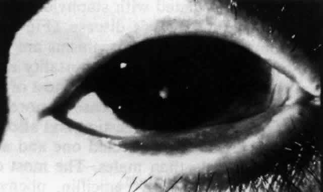 Ectodermal dysplasia, in conjunction with ectrodactyly and cleft lip and palate, has been reported as a syndrome.235,240 These patients exhibit photophobia, chronic blepharitis, entropion, lacrimal system anomalies, and corneal scarring. Reported systemic anomalies have included congenital absence of one kidney, deformities of the external ear, hypoplastic nipples, and multiple small cutaneous melanomas.240 Corneal changes associated with ectodermal dysplasia have been attributed, in some cases, to deficient lacrimation.238 However, Baum and Bull believe that the corneal disease is due to an inherent epithelial defect. Their patient exhibited diffuse stromal opacification in the upper third of both corneas, beginning as superficial stromal infiltration and later becoming more diffuse, opaque, and vascularized. A keratoplasty was performed, but the graft became opacified when it failed to re-epithelialize. The authors suggest that this failure to re-epithelialize was due to the basic ectodermal defect in the host epithelium.235 Treatment There is no known effective treatment for this disorder. MALIGNANT ATROPHIC PAPULOSIS Definition Malignant atrophic papulosis, or Degos' syndrome, is a rare endovasculitis that affects the skin, intestine, eye, and other organs. It is usually a rapidly fatal disease affecting primarily young and middle-aged men.241,242 Clinically, these patients develop disseminated papular lesions of the skin over the front of the trunk and proximal parts and flexor surfaces of the extremities. Eyelids, hands, and oral mucosa may also be involved.241 Presenting as pink-to-red round or oval papules 2 to 10 mm in diameter, these lesions progress to form porcelain-white atrophic central depressions that are often surrounded by telangiectasia (Fig. 36).241