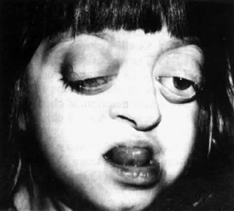 Oculomandibulofacial Dyscephaly Oculomandibulofacial dyscephaly ( Hallermann-Streiff syndrome) is a syndrome of multiple congenital anomalies of the head and face, which gives affected patients a birdlike appearance (23–25). The brow and parietal areas are prominent and the occiput is flat. The sutures and fontanelles remain open at least through infancy and frequently for many years. Size at birth is normal, although dwarfism develops during childhood. In the newborn, the tip of the nose is small and has a beaked appearance; older patients have a long thin nose and receding chin. There is frequently atrophy of the skin of the face. The hair is thin and sparse, with areas of baldness. The mouth and tongue are small, and the palate is high. Dentition is irregular; some teeth never form. Malocclusion is common. There may be anterior displacement of the temporomandibular joint. The ears are low set. The testicles are usually small and undescended. The joints are often hyperextensible, especially the knees. One in 6 patients shows mental retardation. Of the approximately 60 cases reported, familial occurrence has been infrequent. There are no definite chromosomal abnormalities. Ocular findings include microphthalmos and microcornea, congenital cataracts, antimongoloid slant of the lids, blue scleras, pupillary membranes, nystagmus, strabismus, and retinal anomalies. Eyelashes and eyebrows often are sparse or absent. Orbits are small with reduced interorbital distance. Facial Hemiatrophy Facial hemiatrophy (Perry-Romberg syndrome) is a progressive and destructive disease with onset in preadolescence in 75% of patients. It most often affects the face, but there may be extension to the neck, shoulder, trunk, and extremities (26, 27). The brain may also show hemiatrophy, and homolateral migraine and contralateral epilepsy are frequently encountered. Hemiatrophy of fat and subcutaneous tissue is usually the presenting sign in the disease. When the disorder is well developed the appearance is striking: the affected half of the face is sunken and wrinkled. The atrophy frequently involves the soft palate and tongue on the affected side. The maxillary, malar, and palatine bones are smaller and flatter than on the normal side. The external ear may be shrunken and may show appendages. Alopecia and whitening of the hair of the head are manifest early. There may be a localized scleroderma of the forehead near the midline in the form of coup de sabre. Also seen on the affected side are vitiligo, moles, nevus flammeus, and white eyelashes. Ocular involvement occurred in one series in 19 of 148 patients. Horner's syndrome is fairly common. Enophthalmos, mydriasis, heterochromia iridis, blepharophimosis, ptosis, eye muscle palsies, and nystagmus have been reported on the involved side. A congenitally cystic eyeball has been noted. After a progressive and irritative stage, the disease may remain unchanged for many years. Some of the cases are familial, and a recessive inheritance has been suggested. Some believe that facial hemiatrophy is related to a disturbance of the sympathetic nervous system. CRANIAL AND CRANIOFACIAL DEFORMITY SYNDROMES The Craniostenoses The craniostenoses include a heterogeneous group of cranial anomalies characterized principally by the premature closure of one or more suture lines in the developing calvarium (28–30). The resulting defect is a function of (1) which suture or sutures are closed, (2) the time in development at which closure takes place, and (3) the extent of closure. The clinical signs and symptoms produced by the craniostenoses depend on the degree of cerebral and foraminal compression that occurs as a result of the bony deformities. The principal groupings include the following: