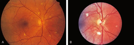 to those of the primary diseases. In many acquired immunodeficiency states, immune dysfunction does not contribute substantially to clinical manifestations. Reviewed here are several disorders in which altered host defenses lead to prominent clinical problems. ACQUIRED IMMUNODEFICIENCY SYNDROME AIDS was first reported in the early 1980s, and its ocular complications were described soon thereafter.87–89 It is the most severe in a spectrum of immunodeficiency states caused by infection with the human immunodeficiency virus (HIV). Infection with HIV is characterized predominantly by T-lymphocyte deficiency. The initial step in HIV infection is binding of the envelope protein of HIV to the receptor on the host CD4+ T lymphocyte; chemokine receptors, such as CCR5 or CXCR4, act as coreceptors and are also necessary for binding. After fusion with the host cell membrane has occurred, the RNA of the virus undergoes reverse transcription, forming DNA, which enters the host cell nucleus and is integrated into the genetic material of the cell. This HIV-encoded DNA is transcribed into messenger RNA, which is then translated into viral proteins, including HIV protease, that are required for processing other HIV-encoded proteins into their functional forms. The newly assembled virus then buds from the cell surface, and new cellular infections occur. Host CD4+ T lymphocytes are depleted through a combination of increased destruction and impaired thymic production.90 The mechanisms of HIV-related disease are far too complicated to be reviewed here, but they ultimately result from dysregulation of the immune system, especially cell-mediated immunity, that occurs because of continuous CD4+ T-lymphocyte destruction and depletion. Impaired cellular immunity facilitates diseases associated with infectious agents, including both productive infections in various end organs and neoplasms that result from malignant transformation of infected cells; examples of the latter include Kaposi's sarcoma (KS), caused by human herpes virus type 8, and squamous cell carcinoma, caused by human papillomavirus. Many opportunistic infections result from reactivation of previously acquired agents of low virulence that are usually controlled by normal host immune defenses; examples include CMV, P. carinii, varicella-zoster virus, and Toxoplasma gondii. People infected with HIV seem to be predisposed to specific infectious agents (including those already noted, as well as Candida sp. and MCV) with involvement of specific organs (e.g., CMV retinitis or P. carinii pneumonia). Humoral immunity is also affected. Although HIV infection is associated with a polyclonal gammopathy, the B-lymphocyte response to new antigens is markedly impaired. In addition, production of cytokines, such as IFN-γ (which activates macrophages to kill intracellular pathogens) and interleukin-2 (which allows T-lymphocyte proliferation), is impaired. Most patients are infected with HIV-type 1 (HIV-1). A retrovirus with lymphotropic properties similar to HIV-1 was isolated from two people in West Africa in 1986 and is called human immunodeficiency virus, type 2 (HIV-2).91 Although HIV-2 also causes AIDS, it appears to be less pathogenic than HIV-1, with a longer latency period of infection, less severe manifestations of disease, and longer survival after diagnosis of AIDS. The seroprevalence of HIV-2 is greatest in West Africa. Ocular complications of HIV-2 infection appear to be uncommon.92 For this reason, the term HIV in this chapter refers to HIV-1, unless specifically indicated otherwise. The severity of immune dysfunction varies considerably between HIV-infected people but tends to become progressively worse over time, if untreated. Those infected with HIV can be asymptomatic; they can have nonspecific manifestations of HIV infection itself, such as lymphadenopathy; or they can have the overt manifestations of HIV-associated opportunistic infection and neoplasms. The AIDS is defined as a CD4+ T-lymphocyte count less than 200/μl (or percentage of CD4+ T-lymphocytes less than 14% of total lymphocytes) or the occurrence of one or more of a specific group of opportunistic infections and neoplasms predictive of severe immunodeficiency.93 HIV can be transmitted by one of three routes: (1) sexual intercourse; (2) percutaneous inoculation (sharing of needles by injection drug users, transfusion of contaminated blood products, accidental needle-stick injuries in health care workers); and (3) maternal-infant (vertical) transmission (in utero, during birth, or by breast-feeding). In the first two decades of the AIDS epidemic, the demographics of the disease in the United States have changed from largely a disorder of homosexual white men to one affecting a mix of homosexuals, heterosexuals, and injecting drug-users, disproportionately involving African Americans and the poor. In the United States, over 400,000 people had died of AIDS by the year 2000, and there were over 700,000 people living with HIV infection. By 2000, over 60% of new HIV infections in 13- to 19-year-old people were occurring in women. Worldwide, over 16 million people had died, and over 33 million were infected, with over 95% of the 5.6 million adults and children who were newly infected in 1999 living in sub-Saharan Africa and other developing countries. Currently available drugs that act against HIV include reverse transcriptase inhibitors (both nucleoside reverse transcriptase inhibitors and nonnucleoside reverse transcriptase inhibitors) and protease inhibitors.94 AIDS was initially uniformly fatal, but it can now be controlled in many patients with these medications, which are known collectively as highly active antiretroviral therapy (HAART) or potent antiretroviral therapy. These drugs, by interrupting the infection cycle of HIV, allow a partial restoration of immune function and have thereby resulted in a substantial decline in opportunistic infections. At the same time, the widesprea