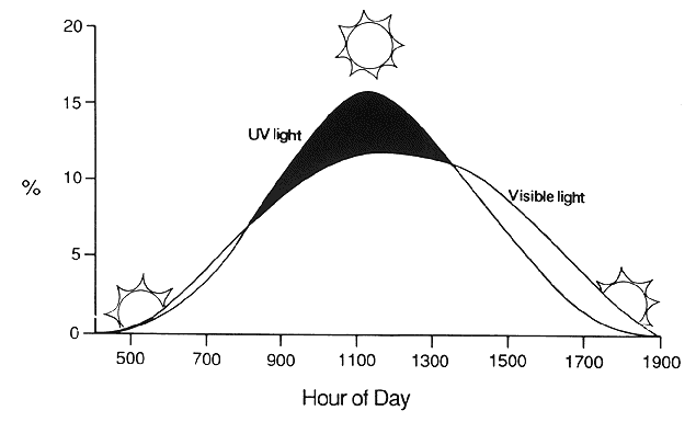 day, reaching its peak between 10 A.M. and 2 P.M. (see Fig. 3). The periods of high levels of UV-B are usually well recognized, because