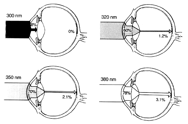 PHYSICAL DEFINITION OF UVR The spectrum of nonionizing radiation ranges from short-wavelength UVR (wavelength 100 nm) to far-infrared radiation (1 mm or 100,000 nm) (Fig. 1). The visible spectrum lies between 400 nm (indigo) to 760 nm (red). Beyond the visible spectrum is infrared radiation, and below the visible spectrum are the shorter wavelengths of nonionizing radiation called ultraviolet radiation (UVR). Although UVR is only 5% of the sun's energy, it is the most hazardous portion encountered by humans. The physical spectrum of UVR ranges from 100 to 400 nm. However, much of the nonionizing radiation is absorbed by the earth's atmosphere. Wavelengths less than 290 nm are totally absorbed by the ozone layer in the stratosphere, and longer wavelengths are absorbed to a lesser extent. Thus, in nature, UVR less than 290 nm does not reach the earth's surface and is not encountered.6 Based on the biologic effects of the different wavelengths or bands, UVR has been subdivided into three bands: UV-A (400 to 320 nm), UV-B (320 to 290 nm), and UV-C (290 to 100 nm).7 UV-A, or near UVR, produces tanning (the browning of the skin due to an increase in the skin content of melanin) and photosensitivity reactions. UV-A is emitted by so-called black lights, which are often used to make objects fluoresce and are also used in tanning salons. UV-B causes sunburn (painful erythema and blistering), and increased exposure to UV-B is associated with an increased rate of skin cancer.6–9 UV-C, which is germicidal and may also cause skin cancer, is not normally encountered on the earth's surface and comes entirely from artificial sources such as germicidal ultraviolet lamps or arc welding. ENVIRONMENTAL, TEMPORAL, AND GEOGRAPHIC VARIATIONS IN ULTRAVIOLET RADIATION UVR is scattered across the whole sky by the Rayleigh effect, just as blue light is scattered.8 Light or broken clouds do not significantly reduce the level of UVR, although levels are reduced by heavy cloud cover.8 A sky with a clear horizon for 360° provides for maximal exposure; when hills, trees, or buildings obstruct part or all of the horizon, the UVR exposure is reduced proportionally.10 UVR can also be reflected by the ground, the amount dependent greatly on the type of surface (Fig. 2). Grass and soil reflect only 1% to 5% of UV-B, water 3% to 13%, sand and concrete about 7% to 18%, and fresh snow up to 88%.10 As the sun makes its daily transit, the spectral content of sunlight changes substantially (Fig. 3). At low incident angles, nearly all visible and ultraviolet energy is reflected or absorbed by the atmosphere, giving the familiar reddish hue to early morning and late evening sunlight. The UV-A and UV-B content of sunlight increases as the sun reaches its zenith and progressively decreases during the afternoon. Similarly, the farther from the equator, the more oblique is the angle of sunlight incidence and the lower the UVR level on the ground. Many people have learned the hard way that an hour's exposure to tropical sunlight imparts a far greater dose of UV-B than does an hour on the beach in New England or the Pacific Northwest. As the Earth tilts to produce changing seasons, so too does the angle of sunlight incidence and the resulting UVR content of sunlight, with summer sunlight imparting far greater doses of UV-B than sunlight of other seasons. The ambient dose of UVR also increases somewhat at higher altitudes, because there is less atmosphere to filter the sun's energy. UV-B exposure increases approximately 20% per 10,000 feet. Climbers have frequently discovered that they are vulnerable to sunburn even when the sun seems to exert little warming effect. Persons climbing and skiing on snow-covered peaks are at particular risk because of the extremely high ultraviolet reflectivity of snow and ice. The eyes are normally protected and shielded from UVR by a number of factors11,12aand only receive a small fraction of ambient UV-B under normal circumstances. The normal horizontal alignment of the eyes and the orbits significantly reduces ocular exposure to whole-sky irradiation. Further anatomical protection is provided by the brows, the nose, and the cheeks.13 The eyelids provide protection that is further enhanced by squinting, a common reflex in bright sunlight. The eyes are relatively unprotected laterally, although the transmission of UVR by internal reflection in the cornea may lead to a concentration of ultraviolet irradiation at the nasal limbus.14 Other personal factors that can decrease ocular UVR exposure in a given environment include wearing a hat and protective eyeglasses.11,12 Taken together, these different factors result in an ocular exposure that is between 7% and 17% less than the ambient UVR level.12 OCULAR TRANSMISSION OF ULTRAVIOLET RADIATION Only a fraction of the UVR entering the eyes reaches the retina-a fact with important photobiologic implications (Fig. 4). The amount of radiation that is absorbed determines the potential for damage to the absorbing tissue. Energy from the dissipation of the absorbed radiation results in tissue damage. Radiation that is not absorbed by a superficial tissue will be transmitted and can affect deeper tissues. The cornea absorbs almost 100% of UV-C radiation (below 290 nm), but transmission rapidly increases for longer wavelengths, so that, for instance, 60% of radiation at 320 nm is transmitted by the cornea.15–18 A normal young human lens absorbs most UVR below 370 nm. As the human lens yellows with age, it absorbs even more UV-A and also shorter blue wavelengths.18,19 In adults, less than 1% of radiation between 320 and 340 nm and only 2% of radiation of 360 nm reaches the retina.20 The lens is exposed to and absorbs most of the UV-B entering the eye. MECHANISMS OF PHOTOTOXICITY The energy carried by a photon is directly proportional to its frequency; thus, the shorter the wavelength, the higher the energy. A photon's energy is absorbed by the atom or molecule with wh