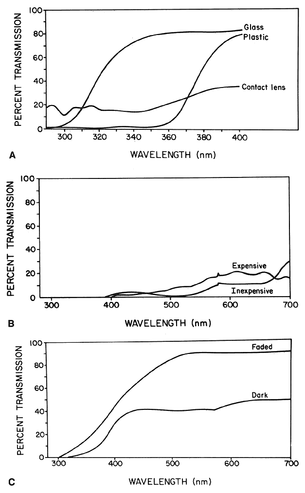 Given the evidence linking both UV-A and UV-B to ocular disease, prudence suggests seeking maximum UVR protection from spectacles, as long as the cost is reasonable. In fact, the addition of UVR-absorbing chromophores during manufacture of lenses introduces negligible cost. Many sunglasses manufacturers voluntarily exceed those standards and label their products as being 100% UVR absorbing. Some even specify “100% absorbing below 400 nm,” which is the labeling patients should seek whenever possible. A number of studies have examined the UVR-absorbing properties of nonprescription sunglasses (Table 3; Fig. 6B).66,67 The UV-B incident on the eyes of specially constructed mannequins equipped with sunglasses has also been measured.68 Thirty-two pairs of “discount” (i.e., less than $7.00) sunglasses were purchased at random in local pharmacies. None of the lenses transmitted more than 1.8% of total UV-B, suggesting that manufacturing processes have recognized the importance of UVR-absorbing chromophores in recent years.