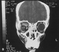 technique is fascinating and worthy of explanation. There are three steps in the image guidance process: (a) preoperative imaging, (b) intraoperative registration of anatomic landmarks with the scans, and (c) intraoperative navigation. Prior to preoperative imaging, markers (known as fiducials) are placed on the patient's skin, usually behind and above the ear. The position of the fiducials can be seen on the scans. In the operating room, the patient, the probe and the computer are linked in the registration process. A “camera” linked to the computer “sees” the probe as the surgeon touches a fiducials on the patient with a probe. The exact three-dimensional position of the probe is recorded in the computer. The registration process continues in a similar manner, linking each fiducial on the patient with its position on the computer image. Additional registration points are linked using anatomic landmarks such as the tragus. The more points that are registered the higher the accuracy of the subsequent navigation. The operation proceeds in normal fashion. When confirmation of the location of any anatomic structure is desired, the probe is placed into at that position, the camera “sees” the probe, and the computer shows the position of the probe on the monitor (Fig. 4). Different probe configurations allow simultaneous positioning of more than one probe. It is possible to use a drill or suction catheter as a probe so that the intraoperative position of these devices can be visualized while being used. The accuracy of intraoperative navigation can be in the submillimeter range if high-resolution scans and accurate registration are used. Functional endoscopic sinus surgery and skull base operations are examples of procedures in which complex anatomy exists, often with variation from patient to patient or even side to side. Disease processes such as tumors or polyps can distort the anatomy as well. In these cases, the time spent in setting up the equipment and registering the system can be worthwhile. Surgical navigation has been used in orbital surgery, especially intraorbital foreign body removal or those orbital cases involving combined sinus and intracranial approaches. No doubt new innovations in imaging and computer technology will expand the uses of image guidance systems. |