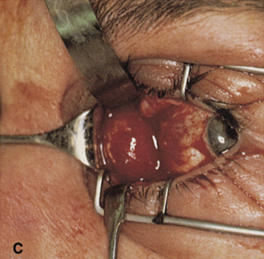 by medical management or radiation therapy. An incisional biopsy is performed when a representative piece of tissue is removed but some of the lesion is left behind. This type of biopsy is used to confirm a clinical diagnosis before proceeding with medical therapy or radiation therapy (e.g., lymphoma, orbital pseudotumor, rhabdomyosarcoma). It also may be used to obtain a tissue diagnosis before planning a definitive surgical treatment such as exenteration or extensive orbitocranial resection (e.g., malignant lacrimal gland tumors). In some cases, incisional biopsy provides a tissue diagnosis and also is used to debulk a tumor. Diffuse infiltrative orbital lesions usually require incisional biopsy to confirm the diagnosis before other therapy can begin. An excisional biopsy is performed when an orbital mass is removed in its entirety. Excisional biopsy is performed on lesions that are believed to be benign, well localized, and easy to remove without damage to surrounding orbital tissues. As a general rule, well-circumscribed and encapsulated lesions are treated with excisional biopsy. This is especially important in cases of benign mixed tumors of the lacrimal gland or orbital dermoid cysts where incision through an intact capsule dramatically increases the chance of recurrence and orbital morbidity. In general, malignant lesions of the orbit are not amenable to excisional biopsies, because tumor-free microscopic margins cannot be obtained in orbital fat. |