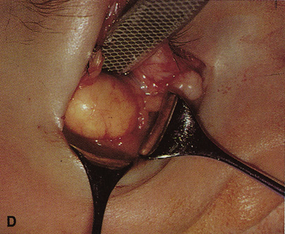 After the periorbita has been elevated internally, and the periosteum reflected laterally and superiorly to completely expose the lateral rim, a large malleable retractor is placed between the orbital contents and the mesial surface of the lateral orbital rim. This protects the orbital contents while an air-driven saw is used to make two osteotomies. One is placed superiorly about 0.5 cm above the zygomaticofrontal suture. Aligning the saw blade toward the upper molars on the opposite side (an angle of 45°) produces a wide opening while avoiding inadvertent entry into the overlying frontal cranial fossa by the saw blade. Finger palpation of the orbital roof beneath the brow reminds the surgeon of the location of the frontal lobe and helps ensure that the saw is not angled in a fashion to allow intracranial penetration. A second osteotomy is made inferiorly through the lateral rim just adjacent to the floor of the orbit above the zygomatic arch. The osteotomies may be shifted superiorly or inferiorly depending on the exact location of the orbital lesion, but an opening in the lateral wall of 2.5 to 3 cm is desirable. After the saw cuts have been made, a wire-passing drill bit is used to preplace drill holes above and below each of the two osteotomies so that the bone can be refixated at the completion of the procedure. Care is taken again to angle the superior drill hole to avoid intracranial penetration and to protect orbital contents with a wide malleable retractor. The lateral rim is out-fractured with large rongeur by gently “rocking” the rim outward, and remaining strands of temporalis muscle at the posterior edge of the bone fragment may be cut with the unipolar cautery. The rim is removed and placed off the field in moist gauze. Great care is taken to avoid inadvertent contamination of the lateral rim as it will be replaced at the end of the procedure. After out-fracture of the lateral rim, the thinner bone behind the rim can be removed with a rongeur to provide better access to the orbital apex. Bone removal usually is carried posteriorly to the pterion, the thicker wedge of cancellous bone that constitutes the body of the greater wing of the sphenoid. Hemorrhage from the cancellous bone may be brisk and may require tamponade with bone wax for control. The temporalis fascia is retracted posteriorly with broad malleable retractors so that the apical periorbita can be exposed. Relaxing incisions can be made with the unipolar cautery through the superior temporalis muscle if it is difficult to adequately expose the apex. The lateral rectus muscle and lacrimal gland lie just beneath the periorbita along the lateral orbit (see Fig. 6F), and damage to these structures is avoided by opening the periorbita with blunt-tipped scissors. A traction suture placed transconjunctivally beneath the insertion of the muscle can be manipulated to help identify the belly of the lateral rectus posteriorly in the orbit. A longitudinal periorbital incision beginning anteriorly and extending back to the orbital apex will allow extensive retraction of the periorbita. Additional vertical relaxing incisions through the periorbita may be made anteriorly. The periorbita is retracted, and the lateral rectus muscle and lacrimal gland are identified. If the lesion lies in the intraconal space, sharp dissection to release the intermuscular septum, either above or below the lateral rectus muscle, is usually required to gain access to the retrobulbar space. Sewall orbital retractors provide retraction of the lacrimal gland and lateral rectus muscle. Depending on the location of the lesion superiorly or inferiorly within the orbit, dissection is carried out above the superior border or below the inferior border of the retracted lateral rectus muscle. Deep orbital dissection requires fiberoptic illumination and loupe magnification at a minimum, and often it is best performed with the operating microscope to aid in identification of the vital vascular and neural structures within the orbit. After removal or biopsy of the proposed lesion, the orbital rim is reinserted and fixated with sutures passed through the predrilled holes, or with rigid screw and microplate fixation (see Fig. 6H). Usually it is not necessary or desirable to close the periorbita because this allows for decompression of any postoperative retro-orbital hemorrhage into the temporal fossa. After the bone has been resutured in place, the anterior cut edges of periorbita and periosteum along the lateral rim may be loosely reapposed over it to prevent the overlying orbicularis-skin flap from adhering to the bare bony rim. The eyelid crease incision can be closed with a running suture (see Fig. 6I) as one would after upper blepharoplasty. A drain may be placed in the temporal fossa and brought through the lateral aspect of the incision or through a separate stab wound and connected to external suction for the first 24 hours postoperatively if there is any question about complete hemostasis. Indications Lateral orbitotomy provides excellent access to deep lesions in the subperiosteal, peripheral, or intraconal space lateral to the optic nerve (Fig. 8A, B).