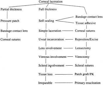 PREOPERATIVE MANAGEMENT To determine the extent of injury, a meticulous preoperative assessment is crucial. A detailed history of the traumatic event should be taken. One must consider the presence of an intraocular foreign body. If a perforating injury is suspected, a rigid protective shield should be used to avoid any inadvertent pressure on the globe that may result in extrusion of intraocular contents.1 Radiologic testing is obtained as necessary, again stressing to all of those involved the importance of avoiding external pressure on the eye during the study. Orders are written to give the patient nothing by mouth in anticipation of surgical intervention. Antiemetics and analgesics are administered to avoid vomiting and agitation. Appropriate informed consent for the surgical procedure(s) anticipated should be obtained before administering any pain medications or sedatives. Immediate family members should be notified when possible. The proper operating room staff should be assembled and surgery should be performed as soon as possible. Administration of broad-spectrum intravenous antibiotics is begun immediately. A combination of a cephalosporin (e.g., cefazolin) or vancomycin for gram-positive bacteria and an aminoglycoside (e.g., gentamicin) for gram-negative prophylaxis may be appropriate. Vancomycin may be preferable to a cephalosporin because of better coverage of Bacillus species and resistant Staphylococcus epidermidis.2 Clindamycin is added to this regimen if an intraocular foreign body is present, especially if the wound has been contaminated with vegetable matter, because such patients are prone to devastating Bacillus infections.2 Fluoroquinolone agents (e.g., levofloxacin), which have a broad spectrum of activity against gram-positive, gram-negative, and atypical bacteria, may be used as well. Subconjunctival antibiotic injections are avoided preoperatively because they may cause eyelid squeezing and could potentially deliver concentrated drug into the open globe. Similarly, topical antibiotics are avoided unless the wound is self-sealing. Although the risk of tetanus from an anterior segment injury is low, tetanus prophylaxis should be administered in accordance with the recommendations of the Centers for Disease Control and Prevention.3 During repair of corneoscleral lacerations, cultures should be taken from the wound margins, prolapsed and devitalized tissues, and intraocular foreign bodies if there is a high index of suspicion for infection. Specimens are inoculated directly on blood and chocolate agar plates, Sabouraud's dextrose medium for fungus, and fluid thioglycolate or cooked meat broth for anaerobes. CONJUNCTIVAL LACERATIONS With any conjunctival laceration, one should always consider the possibility of an occult globe rupture, laceration, or retained intraocular foreign body. A topical anesthetic agent should be instilled and the laceration carefully examined with particular attention to the underlying sclera. Conjunctival lacerations of less than 1 cm generally do not require surgical repair. Smaller wounds that are gaped as the result of tissue avulsion, or those with poor appositional closure, should be sutured closed. For larger conjunctival lacerations, closure may be obtained by good wound apposition and suturing with either absorbable or nylon sutures. Care is taken to avoid incarcerating Tenon's capsule. Lacerations involving the plica, semilunar fold, or caruncle warrant restoration of normal anatomic relationships to prevent scarring and poor cosmesis. CORNEAL LACERATIONS With surgical repair of corneoscleral lacerations, the primary goal is to achieve a watertight globe and maintain structural integrity. Secondary goals include removing any disrupted lens fragments and vitreous, repositioning any uveal tissue, relieving vitreous incarceration, removing any intraocular foreign bodies, and restoring normal anatomic relationships. A methodic surgical strategy is essential for injury repair. Such a stepwise schema affords the surgeon a standard and reproducible approach to the protean manifestations of penetrating anterior segment trauma (Fig. 1).