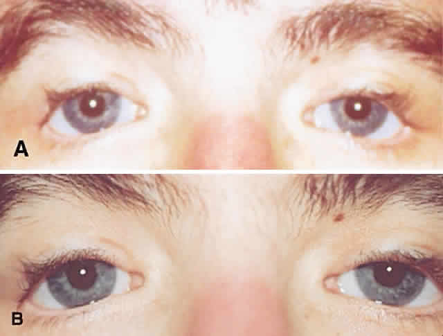 The syndrome results from sympathetic denervation of Müller's muscle and other structures that receive sympathetic innervation. Deficient melanocyte development in the involved iris leads to less pigmentation in the eye if the condition is congenital or if it is acquired neonatally (see Fig. 15). Cocaine will not dilate a Horner's syndrome pupil. Paredrine (Pharmics, Salt Lake City) will dilate the pupil if the third-order neuron is intact. Horner's syndrome may be treated successfully with a Fasanella-Servat or tarsal Müller's muscle resection. A small levator resection produces equally satisfactory results. |