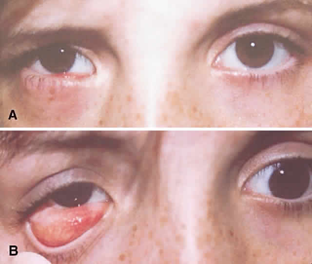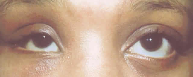 KEARNS-SAYRE SYNDROME AND CHRONIC PROGRESSIVE EXTERNAL OPHTHALMOPLEGIA Kearns-Sayre syndrome is a mitochondrial deletion disorder characterized by progressive external ophthalmoplegia, heart block, retinitis pigmentosa and, occasionally, with endocrine and central nervous system manifestations.44–46 These disorders begin in childhood and patients often present to the ophthalmologist with complaints of blepharoptosis. The conditions are most likely to become symptomatic in the first or second decade. Bilateral ptosis is a prominent feature of the syndromes, and levator function is poor. Systemic associated problems are of primary importance. Frontalis suspension procedures are required for correction of ptosis but limited ocular rotations make corneal exposure risks significant. However, ptosis surgery has functional implications in most cases. Upper lid blepharoplasty has been recommended as a safer alternative to suspension when corneal exposure is expected to be a postoperative problem.47 Chronic progressive external ophthalmoplegia may be considered a limited form of Kearns-Sayre syndrome that shares the ocular manifestations but has fewer systemic manifestations. However, this distinction is not helpful in the individual case because affected patients also may have night blindness, cardiac conduction defects, and other systemic symptoms. Progressive external ophthalmoplegia usually begins in the second or third decade and ptosis is a common presenting sign. Ophthalmoplegia develops fairly early and may be accompanied by diplopia in the occasional case in which extraocular involvement is asymmetric. Many systemic associations have been described. Extraocular muscle surgery can be helpful in certain patients.48 Myotonic Dystrophy Myotonic dystrophy shares many of the manifestations of Kearns-Sayre and chronic progressive external ophthalmoplegia syndromes, but, in addition, patients have polychromatic cataracts, gonadal atrophy, premature thinning or loss of the hair, and other systemic problems. Delayed (myotonic) relaxation of skeletal muscles may prolong a hand-shake. The disorder is believed to be the most common inherited neuromuscular disease in adults. It is an autosomal dominant disorder that is characterized clinically by myotonia and progressive muscular weakness. Myotonic dystrophy may occur congenitally. The disorder has been localized to chromosome 19. Ptosis is a prominent early feature. Myasthenia gravis has been reported to be associated but is considered to be a separate and distinct entity.49,50 Blepharochalasis Infiltrative processes that thicken the lids and produce blepharoptosis characterize blepharochalasis. Angioedema frequently involves the upper lids through recurrent episodes of eyelid edema. Edema can be of startling proportions. The condition may be unilateral or bilateral, active or quiescent, with hypertrophic and atrophic forms. Thinning of the levator aponeurosis occurs with repeated attacks until ptosis results. The lacrimal glands may prolapse. Orbital fat also is affected and progressively atrophies. As a result of fat atrophy and ptosis, patients have an emaciated appearance about the eyes. C1 esterase inhibitor levels may be deficient, particularly if the condition is familial.51 Because of poor levator function in severe cases, the surgeon may perform a frontalis suspension but the suspension material will be visible beneath the very thin eyelid skin. A surgical procedure on the eyelids may be more hazardous because of the extreme thinning of the lids. The best procedure is an aponeurosis repair in which nonabsorbable sutures are used to reattach aponeurosis to tarsus. Aponeurosis dehiscence may not be as readily visible to the surgeon as in the adult with acquired ptosis. The aponeurosis usually can be found detached from the tarsus and elevated behind the orbital septum which must be unrolled to expose the aponeurosis. Redundant eyelid skin will be evident after the levator is reattached and the lid is repositioned. Excess skin should be excised. Other causes of blepharochalasis should be treated by treating the underlying disease process or by blepharoplasty procedures. Myasthenia Gravis A defect at the myoneural junction that produces relative unresponsiveness to released acetylcholine characterizes myasthenia gravis. This condition may be transient, congenital, and familial. Presenting symptoms are frequently ocular and ptosis is a prominent feature of the disorder. Several simple office tests have been useful in the office diagnosis of myasthenia.52–58 The office diagnosis of myasthenia gravis usually is verified with a Tensilon (ICN Pharmaceuticals, Costa Mesa, CA) test, although false-positive, false-negative, and paradoxical responses occur. Preinjection and postinjection measurements of lid position are made. Elevation of the lids in response to the injection indicates the likelihood of myasthenia gravis. Diagnosis also may be made with sophisticated eye movement recording devices or with single fiber electromyography. Additional confirmation of the diagnosis by measurement of serum acetylcholine receptor antibodies can be done but, in our office, this test has been positive in fewer than 50% of our patients with proven ocular myasthenia. Response to treatment is useful diagnostically. Myasthenia gravis with significant eyelid and eye muscle involvement seldom responds to Mestinon (Roche, Nutley, NJ) alone; often, corticosteroids are required for control of the myasthenia. Even then, restoration of lid position to acceptable levels is not always achieved. Surgical procedures can be helpful in the management of myasthenic blepharoptosis. However, benefits may be temporary, and operative procedures may have to be repeated. Depending on levator function, an external levator resection or a frontalis suspension procedure may be required although the general rule is to be conservative both in the recommendation for and in the performance o