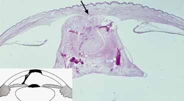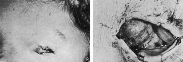 can appear as a form of microphthalmos or apparent anophthalmos. Cryptophthalmos is another relatively rare condition characterized by replacement of the eyelids with facial skin covering the orbit from the forehead to the cheek, connecting to the underlying globe and obliterating the cornea (Fig. 2A).6 This condition represents metaplastic change of the corneal epithelium and conjunctiva into stratified squamous keratinized epithelium.7 Cryptophthalmos can be unilateral or bilateral and usually occurs sporadically along with other congenital malformations including dyscephaly, syndactyly, and urogenital malformations. Although the pathogenesis is unclear, animal models suggest possible causes of cryptophthalmos syndrome to include defects in programmed cell death or vitamin A metabolism.8 An autosomal-recessive pattern of inheritance has been described for cryptophthalmos in as many as 25% of cases examined.9 Recent reviews have detailed the association of cryptophthalmos with other congenital malformations.8,9 True (complete) cryptophthalmos, the most common form of this entity, is the result of failed formation of eyelid folds such that lashes and eyebrows are absent. In addition, lacrimal glands and canaliculi are generally absent. Although palpable, the underlying globe is microphthalmic with anterior chamber malformations. B-scan ultrasonography shows in a majority of cases the replacement of the remainder of the cornea and anterior chamber with connective tissue. Partial cryptophthalmos involves only the medial aspect of the eyelid, leaving the lateral eyelid normal in structure and function. Another form is abortive cryptophthalmos, or congenital symblepharon, in which only the upper eyelid undergoes metaplasia and remains adherent to the upper third of the cornea.10 Histopathologically, the skin consists of stratified squamous keratinized epithelium and an underlying dermis without appendages, which is fused to the fibrovascular tissue replacing the cornea. The anterior chamber is small or nonexistent, and the trabecular meshwork, Schlemm's canal, iris, and lens are absent.11 Surgical correction has been attempted for both complete and partial cryptophthalmos. The major goals of surgical intervention are to achieve a cosmetic improvement, to preserve the globe, and to protect any remnant of the cornea from infection (Fig. 2B).12 There has been some success in restoring good visual function in patients with partial cryptophthalmos; however, this is not the true for cases of complete cryptophthalmos.12 |