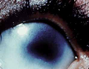 herpes simplex keratitis, bacterial keratitis, and neurotrophic keratitis. HERPES SIMPLEX KERATITIS Ocular involvement occurs in 10% to 40% of neonates with herpes simplex infection and usually appears 1 to 5 months postpartum as a purulent conjunctivitis with a dendriform or geographic epithelial defect (Fig. 10). Eyelids are usually edematous and erythematous and may or may not have vesicular lesions. Ocular manifestations include optic neuritis, cataracts, or chorioretinitis, the latter being a late manifestation. Infection usually occurs during vaginal delivery; however, cases of acquisition in utero have been documented,75 and up to 10% can occur as postnatal infections.76 In studies in which the ocular virus was typed, 15% to 30% were HSV type I.75,77 Topical povidone–iodine is an effective prophylaxis for herpes simplex, as well as for other viruses, fungi and bacteria.78 Topical silver nitrate prophylaxis is not effective.79 Clinical suspicion for ocular herpes simplex can be confounded in some cases given the similarities with bacterial conjunctivitis. In two cases in which herpes simplex keratitis was evident at birth, the infants presented with a purulent exudate, a conjunctival membrane, along with a central epithelial defect and a central stromal opacity. The purulent exudate may lead the clinician to consider bacterial conjunctivitis; however, a history of prenatal vaginal herpes infection or skin vesicles on the infant suggests ocular herpes simplex infection. Unfortunately, up to 30% of mothers have no signs or symptoms of genital herpes simplex infection, further complicating the diagnosis.77 Immediate diagnosis is critical, especially in cases of herpes simplex acquired in utero, because the keratitis may be an early sign of systemic dissemination, which may be fatal. A definitive diagnosis can be made with corneal or conjunctival scrapings showing giant cells or intranuclear inclusions characteristic for HSV. In addition, specimens from conjunctival swabs can be analyzed with kits using fluorescein antibody staining or enzyme immunoassays for the presence of HSV antigens. If the diagnosis is still unclear, viral cultures can be grown from conjunctival swabs. Electron microscopy may also be used to detect viral particles in tear specimens; however, this is not readily available to many ophthalmologists. Management of herpes keratitis must include early use of topical antivirals. Virostatic agents include 1% trifluridine (Viroptic) drops applied up to nine times daily or 3% vidarabine ointment applied up to five times daily; 3% acyclovir ointment (not available in the United States) administered up to five time daily is also effective. Given that idoxuridine was not effective in treating in utero-acquired ocular herpes, this is not recommended as a first line agent.75 Systemic acyclovir therapy must also be considered when skin vesicles are present or if there is evidence of visceral dissemination, for which the mortality rate is 57%.80 It is also worth considering prophylactic antiviral therapy in infants whose mothers had genital herpes at the time of delivery. CONGENITAL RUBELLA Because of the routine administration of the rubella vaccine, congenital rubella occurs much less often in developed countries. When this infection is acquired during the first trimester, it may be transmitted through the placenta and can cause serious congenital anomalies in more than half of these children. Of these affected infants, 6% may manifest corneal opacities at birth81 from three possible causes. First, viral infection of the endothelium may cause a transient central stromal opacity that clears in the first few weeks of life. Second, the corneal edema may result from elevated intraocular pressure, which clears as the pressure spontaneously normalizes.82 Third, corneal edema and scarring may accompany severe microphthalmos with keratoiridal or corneolenticular adhesions (Peters anomaly). Boniuk has thoroughly described the congenital rubella syndrome and its associated ocular findings, which can include congenital cataracts, microphthalmia, iris hypoplasia, and corneal opacification as described.83 A 20-year follow-up of patients with congenital rubella has been reported.84 This study examined 125 cases of congenital rubella and found ocular disease to be the most commonly noted disorder reported in 78% of patients. Multiorgan disease was typical in almost 90% and ocular disease was associated with hearing loss in 58% of cases. A close association was also found between ocular disease and cardiac disease. Cataracts and microphthalmia correlated with poor visual outcomes and glaucoma was often seen in association with either entity. No correlation was found between the gestational age at the time of maternal infection and the incidence of individual ocular disorders.84 BACTERIAL CORNEAL ULCER Bacterial corneal ulcers do not appear at birth and are very uncommon in the neonate. The use of 1% silver nitrate prophylaxis along with effective topical antibiotics has virtually eliminated corneal ulceration in the newborn secondary to bacterial conjunctivitis (ophthalmia neonatorum). When they do occur, these ulcers are usually associated with corneal trauma, preexisting corneal disease, severe systemic disease, or an immunocompromised state.85 Clinical diagnosis alone is difficult and only 30% of cases will present with a hypopyon.85 Definitive diagnosis is based on the results of Gram staining and culture of corneal scrapings and conjunctival swabs. Pseudomonas is the most commonly identified organism in cases of childhood bacterial keratitis. Although normally a nonpathogenic opportunist, ocular Pseudomonas can rapidly invade the conjunctiva and cornea with complications including endophthalmitis and potentially fatal septicemia.86 Topical antibiotics are the mainstay of treatment; which for Pseudomonas include topical gentamicin, tobramycin, ofloxacin, ciprofloxacin, moxifloxacin, gati