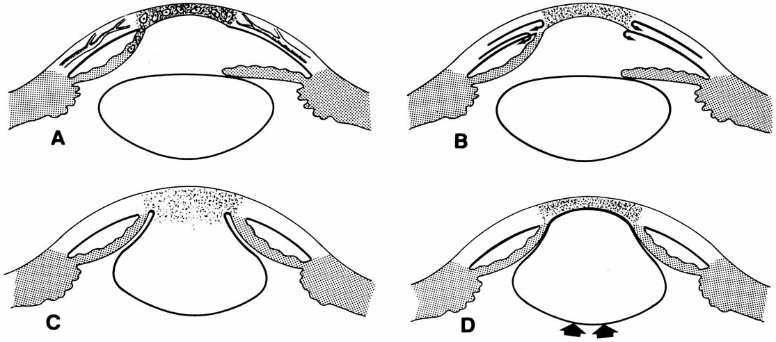 A central or paracentral corneal opacity is the clinical hallmark for the group of congenital abnormalities known as posterior corneal defects. Common histopathological findings include focal attenuation or complete absence of the endothelium and Descemet's membrane behind the overlying opacity. These disorders are part of a group of anomalies referred to as anterior segment mesenchymal dysgenesis or the anterior chamber cleavage syndrome.107,108 Embryologically, these conditions are likely the result of abnormal neural crest cell development.21 A descriptive anatomic stepladder classification scheme (Fig. 15) was developed to help categorize these conditions from simple to more complex forms.108 This classification scheme allows clinicians and pathologists to describe the anatomic findings without the use of eponyms and Latin phrases. There are four clinical groups of congenital posterior corneal defects, demonstrating the full range of severity from a mild indentation of the posterior cornea to total corneal scarring and ectasia. These groups are: