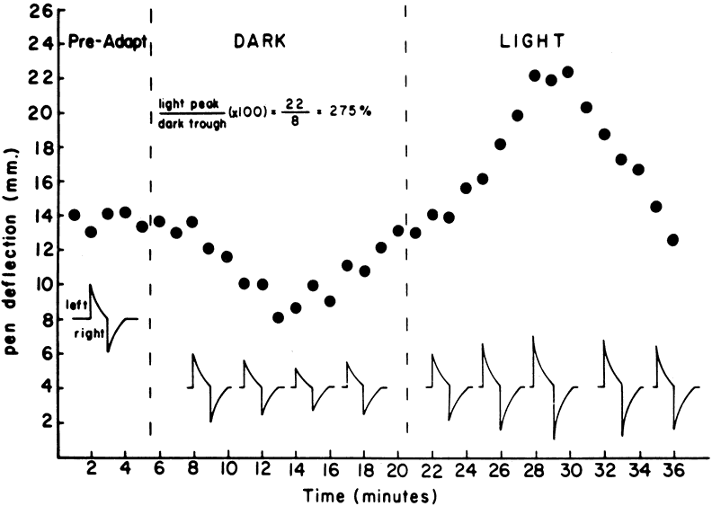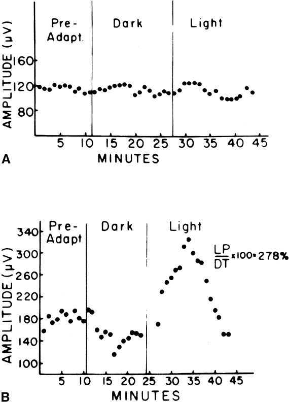 the eye (here considered a dipole) moves back and forth (Fig. 1). The importance of the clinical measurement of the EOG lies in the fact that the amplitude of the response changes when certain luminance conditions are varied. Thus, if a patient is placed in darkness the potential will decrease, whereas if a bright light is turned on following dark adaptation the potential will increase.2 To obtain reproducible and comparable results, recommendations to standardize EOG testing have been made by the International Society of Clinical Electrophysiology of Vision (ISCEV).3 The reader should refer to this article for specific recommendations, but the essence of an EOG is as follows. After a preadaptation period of several minutes to acquaint the patient with the test, the lights are turned off for 15 minutes. Recordings for several saccades are made in the dark at 1-minute intervals. The lowest potential (dark trough) is reached in 8 to 12 minutes. A bright light is then turned on and recordings continue at 1-minute intervals with the potential increasing in amplitude until the highest point (light peak) is reached in 7 to 10 minutes. The ratio of the light peak to the dark trough is then calculated with normal being 165% or greater4 (Fig. 2). It should be noted that this test may be performed with either dilated or undilated pupils, but the amount of light used to induce a full EOG light rise will vary with the pupillary size. Because the EOG light rise is proportional to the amount of light entering the eye up to an asymptote, it is important to have the necessary luminance to obtain a maximal response. Failure to account for this explains many of the lower-than-normal responses reported in the older literature. Each laboratory should establish its own set of standards and these should be obtained using the standardized protocol referred to previously. This electrical response is generated by the retinal pigment epithelium (RPE) with the light peak generated by a depolarization of the basal portion of the RPE.5 To generate this potential, intact photoreceptors, which are apposed to the RPE, are necessary.2 In the clinical situation the EOG almost always parallels the electroretinogram (ERG). Thus, in retinitis pigmentosa a patient with an extinguished ERG will show little or no EOG light rise. This is likewise true of any disorder in which there is a generalized degeneration of most of the photoreceptor cells, including drug-induced retinal toxicity and diffuse chorioretinitis. Although specific abnormalities in the ERG may be recorded in a number of other abnormalities, including congenital stationary night-blindness (CSNB), X-linked retinoschisis, and cone dystrophy, the normalcy or abnormalcy of the EOG is dependent on the total number of functioning photoreceptors in these cases. Thus, in most cases of CSNB, there is an abnormality in neural transmission in the bipolar cell region; the EOG would be normal because of normal functioning rods.6 The same is true in X-linked retinoschisis. In cone dystrophy, although there may be an absence of cones, the large number of functioning rods give a normal EOG. The only disorder in which a grossly abnormal EOG is found in the presence of a normal ERG is in the dominantly inherited disorder of Best's disease (vitelliform macular dystrophy).7 All patients with true Best's disease have an abnormal EOG with ratios invariably below 135% (Fig. 3). As is true of all autosomal dominant disorders there is a wide range of expressivity; thus, an individual who has the gene may show no fundus abnormalities yet has an abnormal EOG.8 Thus, this test serves as an electrophysiologic marker in this disorder and is important in assessing family members, as well as individuals with an atypical retinal picture (Figs. 4 and 5).