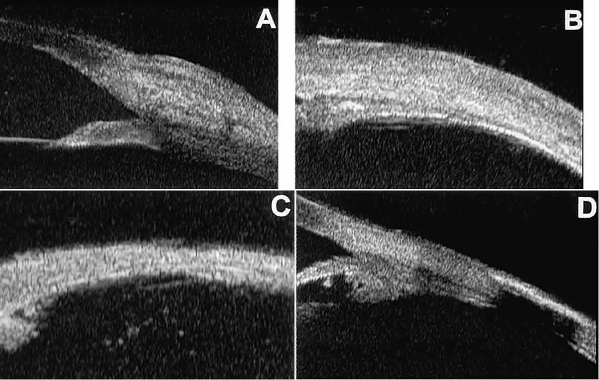Fig. 12. UBM features in glaucomatous eyes after treatment or filtering surgery. A. Incomplete peripheral iridectomy created by laser. B. Full-thickness peripheral iridectomy created by laser. C. Postoperative features of trabeculectomy including peripheral iridectomy, inner scleral defect, thin residual scleral flap, and overlying conjunctival filtering bleb. D. Tube shunt projecting radially into anterior chamber; note that the tube “shadows” deeper structures.