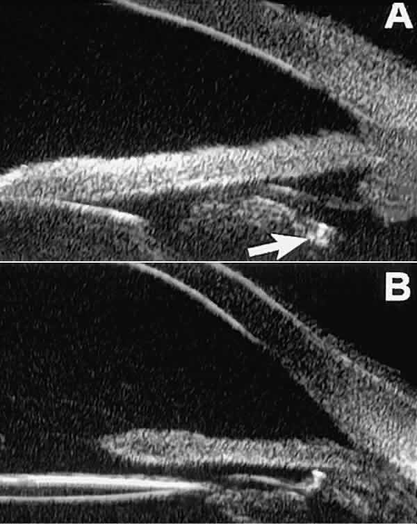 Fig. 18 . Localization of posterior chamber IOL haptics by UBM. A. Haptic in capsular bag (arrow). B. Haptic (bright object just behind peripheral iris) in iridociliary sulcus.