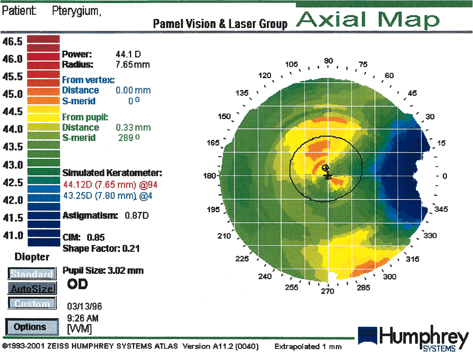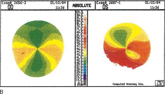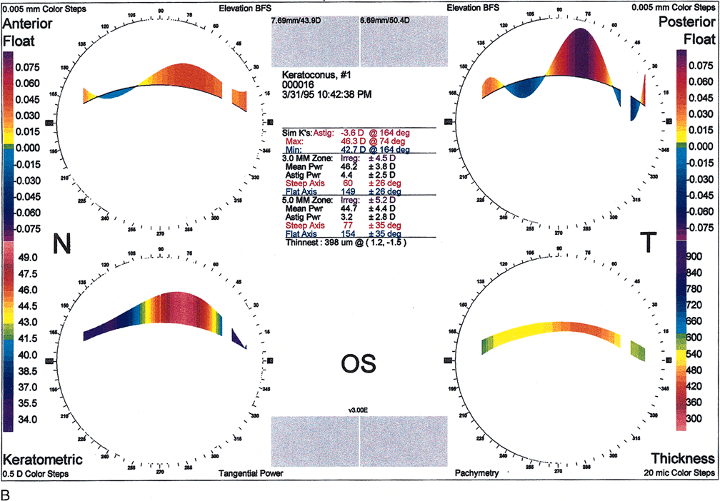 SURFACE MASSES AND PTERYGIA Irregularities of the corneal surface can result from compression by external agents, abnormalities of the corneal epithelium, or stromal alterations. Compression of the cornea can occur from eyelid lesions such as chalazia, lid hemangiomas, and dermoids. Compressive lesions have direct as well as indirect effects on corneal topography. There is a flattening of the corneal curvature directly underneath the eyelid lesion and there is a secondary indirect steepening of the corneal curvature adjacent to the area of flattening. Scleral masses will cause scleral flattening immediately beneath the mass and adjacent corneal steepening. Tear film disturbances and epithelial diseases that affect the tear film canl result in topographic irregularities. The keratometer and Placido disk systems are reflective instruments that rely on an intact air–tear film interface. In such conditions, utilizing a projection-based system to evaluate corneal topography may prove more accurate. Focal patches of dryness such as in keratoconjunctivitis sicca appear as local areas of flattening. More important, however, corneal topography can often detect subtle changes in epithelial regularity, significant enough to cause patient complaints but not visible by slit-lamp biomicroscopy. This has been seen in recurrent erosion syndrome and in anterior basement membrane dystrophy (Fig. 8). A local depression such as an ulcer or dellen may produce focal flattening. Local elevations, such as Salzmann's nodules or Thygeson's keratitis, produce a focal steepening.1 Pterygia affect the corneal epithelium as well as the underlying stroma. Visual disturbances can result from tear-film irregularity or from growth onto the cornea, resulting in astigmatism. Both regular and irregular astigmatism can be induced. There is progressive flattening as the corneal periphery is approached. As the size of pterygium increases, the amount of astigmatism and associated topographic abnormalities increase.13–15 O'Brart and associates determined that the mean keratometric astigmatism induced is about 4 D with-the-rule but the mean refractive astigmatism is about 2 D.16 This does not affect refraction significantly until the pterygium head encroaches on the visual axis (Fig. 9). There are two hypotheses regarding the mechanism of induced astigmatism. One theory proposed by Hochbaum and associates suggests that horizontal steepening is induced in the semi-meridian aligned with the pterygium due to traction from subepithelial fibrosis.17 The second theory proposes that the mechanism is due to the tear film; the tear meniscus in front of the head of the pterygium pools in the angle between the pterygium and the paracentral cornea, leading to the observation of topographic flattening. Pterygium removal results in decreased astigmatism because of steepening of the flat meridian and flattening of the steep perpendicular meridian. In eyes with large pterygia that encroach within 2 mm of the line of sight, astigmatism may not resolve completely. Interestingly, studies have shown that postoperatively, there is an overall increase in mean central corneal power and a reduction of corneal asphericity, suggesting that the ratio of the astigmatic change in the treated meridian to that 90 degrees away was not one-to-one. The amount of surgically induced change in astigmatism increases with the size of the pterygium.18,19 Refractive changes stabilize 1 month postoperatively; therefore, Tomidokoro et colleagues recommend that cataract or other refractive surgery be postponed until this time.13,14 STROMAL ECTASIAS Crneal ectasias are non-inflammatory diseases that are characterized by thinning and protrusion of the corneal stroma resulting in shape changes. This family of diseases consists of keratoconus, keratoglobus, and pellucid marginal degeneration. Normally, the stromal collagen lamellae run circumferentially in the corneal periphery, producing a round shape. However, progressive thinning of the stroma leads to flattening of the corneal curvature along that meridian. This induces the peripheral ring of collagen lamellae to assume a more oval shape and transmits a compressive force to the lamellae that are 90 degrees away, resulting in corneal steepening in that meridian. This mechanism is known as biomechanical coupling. Furthermore, intraocular pressure at the site of weakness causes protrusion of the cornea. Keratoconus Keratoconus is a bilateral but typically asymmetric ectasia that has onset in the late teens and usually progresses slowly over many years. Patients have a history of progressive myopia, oblique astigmatism, and reduction of spectacle-corrected visual acuity. Prior to the introduction of methods to assess corneal topography, the diagnosis was based on history and the presence of clinical signs. In mild disease, however, these clinical signs are subtle or altogether absent. The advent of refractive surgery has made the detection of subclinical keratoconus of increasing importance in order to prevent the surgical treatment of these eyes. Keratoconus has an incidence of 1 in 2000 inf the general population but is being detected in 5% of myopes who present for refractive surgery evaluation.20 Keratoconus can be categorized according to the severity of power (mild, moderate, severe); location of cone (superior, central, inferior); and shape of cone (oval, globus, nipple) (Fig. 10). Corneal thinning most commonly occurs in the inferocentral cornea, and protrusion also occurs in this region. The point of maximal protrusion is referred to as the apex of the cone. The steepest corneal slope lies just peripheral to the apex (usually inferior in central cones). The region of smallest radius of curvature (therefore the greatest corneal power) lies between the cone's apex and its steepest slope. The mechanism of biomechanical coupling causes the flattest meridian to be approximately horizontal and the steepest meridian to l