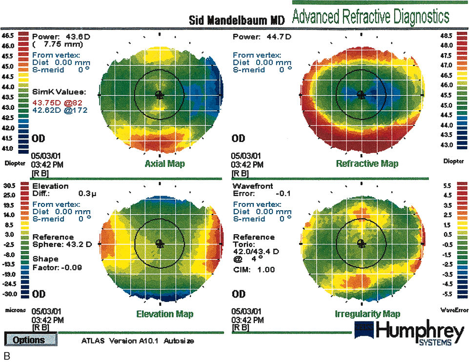 1. Corbett MC, Rosen ES, O'Brart DPS: Corneal Topography: Principles and Applications. London, BMJ Books, 1999. 2. Orbscan Operator's Manual for the Slit Scan Corneal Tomography/Pachymetry System: Software Version 2.10. ORBTEK, Inc., Utah. 3. Gills JP: Corneal Topography: The State of the Art. Slack, Thorofare, NJ, 1995. 4. Naseri A, McLeod SD, Lietman T: Evaluating the human optical system: Corneal topography and wavefront analysis. Ophthalmol Clin North Am 14:269–273, 2001. 5. Haman H: A quick method for analyzing Hartmann-Shack patterns: Application to refractive surgery. J Refract Surg 16: S636–S642, 2000. 6. Mrochen M, Kaemmerer M, Seiler T: Wavefront-guided laser in in-situ keratomileusis: Early results in three eyes. J Refract Surg 16:116–120, 2000. 7. Wilson S, Ambrosio R: Computerized corneal topography and its importance to wavefront technology. Cornea 20:441–454, 2001. 8. Pallikaris IG, Panagopoulou SI, Molebny VV: Clinical experience with the Tracey technology wavefront device. J Refract Surg 16:S588–S591, 2000. 9. Hong X, Thibos LN: Longitudinal evaluation of optical aberrations following laser in in-situ keratomileusis surgery. J Refract Surg 16:S647–S650, 2000. 10. Bogan SJ, Waring GO, Ibrahim O, et al: Classification of normal corneal topography based on computer-assisted videokeratography. Arch Ophthalmol 108:945–949, 1990. 11. Marin-Amat M: The physiological variations of the corneal curvature during life: Their significance in ocular refraction. Bull Soc Belge Ophtalmol 136:263, 1957. 12. Liu Z, Huang A, Pflugfelder SC: Evaluation of corneal thickness and topography in normal eyes using the Orbscan corneal topography system. Br J Ophthalmol 83:774–778, 1999. 13. Tomidokoro A, Oshika T, Amano S, et al: Quantitative analysis of regular and irregular astigmatism induced by pterygium. Cornea 18:412–415, 1999. 14. Tomidokoro A, Miyata K, Sakaguchi Y, et al: Effects of pterygium on corneal spherical power and astigmatism. Ophthalmology 107:1568–1571, 2000. 15. Avisar R, Loya N, Yassur Y, et al: Pterygium-induced corneal astigmatism. Isr Medl Assoc Jl: Imag 2:14–15, 2000. 16. O'Brart DPS, Corbett MC, Rosen ES: The topography of corneal disease. Eur J Implant Refract Surg 7:173–183, 1995. 17. Hochbaum DR, Moskowitz SE, Wirtschafter JD: A quantitative analysis of astigmatism induced by pterygium. J Biomech 10:735–746, 1977. 18. Cinal A, Yasar T, Demirok A, et al: The effect of pterygium surgery on corneal topography. Ophthalmic Surg Lasers. 32:35–40, 2001. 19. Budak K, Khater TT, Friedman NJ, et al: Corneal topographic changes induced by excicision of perilimbal lesions. Ophthalmic Surg Lasers 30:458–464, 1999. 20. Auffarth GU, Wang L, Völcker HE: Keratoconus evaluation using the Orbscan Topography System. J Cataract Refract Surg 26:222–228, 2000. 21. Chastang PJ, Borderie VM, Carvajal-Gonzalez S, et al: Automated keratoconus detection using the EyeSys videokeratoscope. J Cataract Refract Surg 26:675–683, 2000. 22. Rabinowitz YS, Rasheed K: KISA % index: A quantitative videokeratography algorithm embodying minimal topographic criteria for diagnosing keratoconus. J Cataract Refract Surg 25:1327–1335, 1999. 23. Maeda N, Klyce SD, Smokek MK: Comparison of methods for detecting keratoconus using videokeratology. Arch Ophthalmol 113:870–874, 1995. 24. Rao SK, Fogla R, Padmanabhan P, et al: Corneal topography in atypical pellucid marginal degeneration. Cornea 18:265–272, 1999. 25. Karabatasa CH, Cook SD: Topographic analysis in pellucid marginal degeneration and keratoglobus. Eye 10:451–455, 1996. 26. Wilson S, Lin D, Klyce S, et al: Terrien's marginal degeneration: Corneal topography. Refract Corneal Surg 6:15–20, 1990. 27. Zegans ME, Srinivasan M, McHugh T, et al: Mooren ulcer in South India: Serology and clinical risk factors. Am J Ophthalmol 128:205–210, 1999. 28. Zegans ME, Srinivasan M: Mooren's ulcer. Int Ophthalmol Clin 38:81–88, 1998. 29. Riddle HK Jr , Parker DA, Price FW Jr : Management of postkeratoplasty astigmatism. Curr Opin Ophthalmol 9I:15–28, 1998. 30. Borderie VM, Touzeau O, Laroche L: Videokeratography, keratometry, and refraction after penetrating keratoplasty. J Refract Surg 15:32–37, 1999. 31. Shimazaki J, Shimmura S, Tsubota K: Intraoperative versus postoperative suture adjustment after penetrating keratoplasty. Cornea 17:590–594, 1998. 32. Karabatzas CH, Cook SD, Sparrow JM: Proposed classification for topographic patterns seen after penetrating keratoplasty. Br J Ophthalmol 83:403–409, 1999. 33. Touzeau O, Borderie VM, Allouch C, et al. Effects of penetrating keratoplasty suture removal on corneal topography and refraction. Cornea 18:638–644, 1999. 34. Hernandez-Quintela E, Smapunphong S, Khan B: Posterior corneal surface changes after refractive surgery. Ophthalmology 108:1415–1422, 2000. 35. Waring GO 3rd, Lynn MJ, McDonnell PJ:. Results of the Prospective Evaluation of Radial Keratotomy (PERK) study ten years after surgery. Arch Ophthalmol 112:1298–1308, 1994. 36. Barker NH, Couper TA, Taylor HR: Changes in corneal topography after laser in situ keratomileusis for myopia. J Refract Surg 15:46–52, 1999. 37. Sano Y, Carr JD, Takei K, et al: Videokeratography after excimer laser in situ keratomileusis for myopia. Ophthalmology 107:674–684, 2000. 38. Hersh PS: A standardized classification of corneal topography after laser refractive surgery. J Refract Sur 13:571–578, 1997. 39. Lin DT, Sutton HF, Berman A: Corneal topography following excimer photorefractive keratectomy for myopia. J Cataract Refract Surg 19:149–154, 1993. 40. Lin DTC: Corneal topographic analysis after excimer laser photorefractive keratectomy. Ophthalmology 101:1432–1439, 1994. 41. Hersh PS, Schwartz-Goldstein BH: The Summit Photorefractive Keratectomy Topography Study Group: Corneal topography of phase III excimer laser photorefractive keratectomy: characterization and clinical effects. Ophthalmology 102:963–978, 19